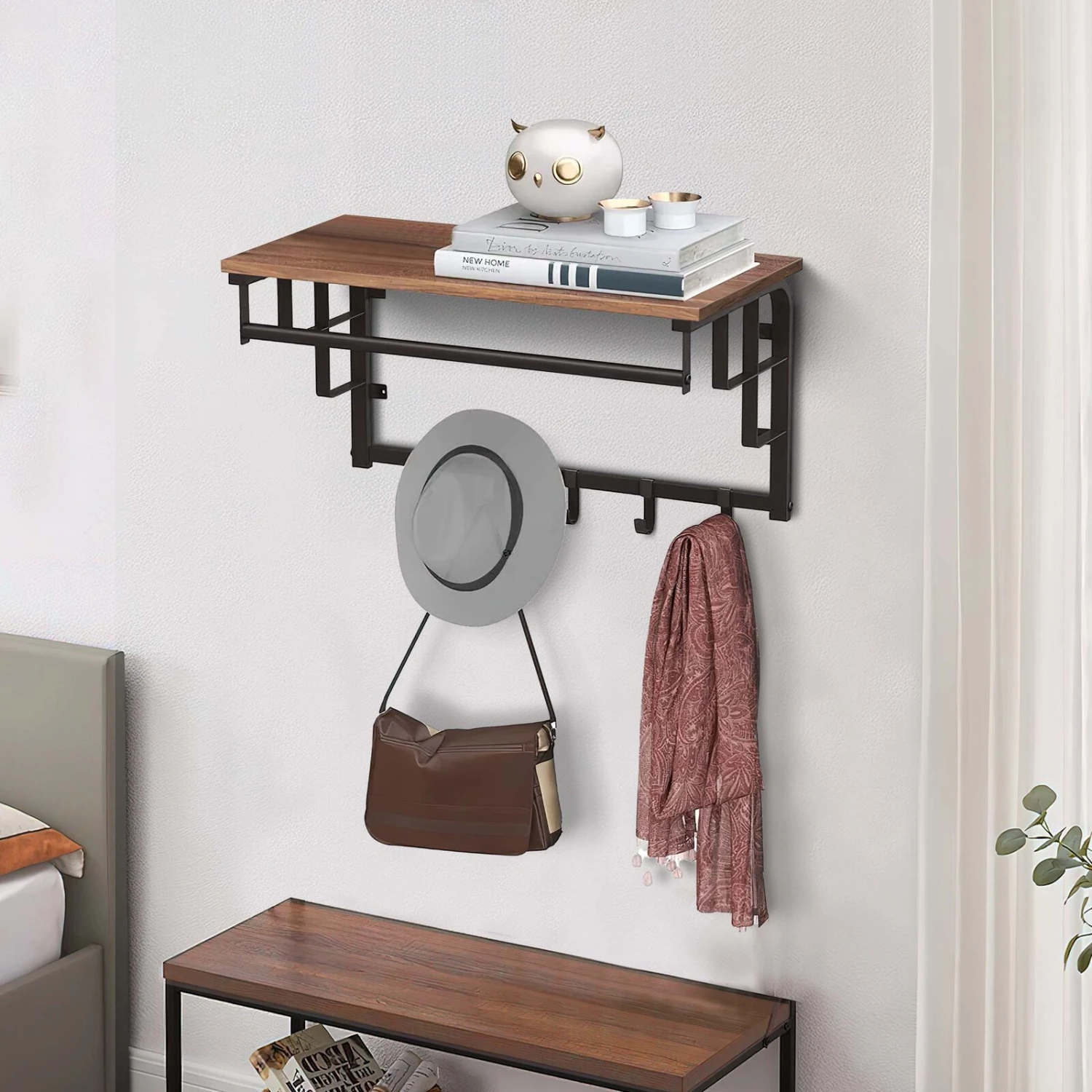 A unique blend of industrial style versatility, this wall mount coat rack makes a remarkable fit for your entryway, hallway, foyer, or mudroom. Featuring five removable hooks to hang coats, hats, scarves, and umbrellas, it comes with a cloth rail. The top display shelf is perfect to showcase your hand-curated decorations, vases, showpieces, and more. Handcrafted from composite wood and metal frame, the rustic brown wood finish complements the black-coated frame. This minimalistic coat rack easily blends in with a wide variety of decor styles.