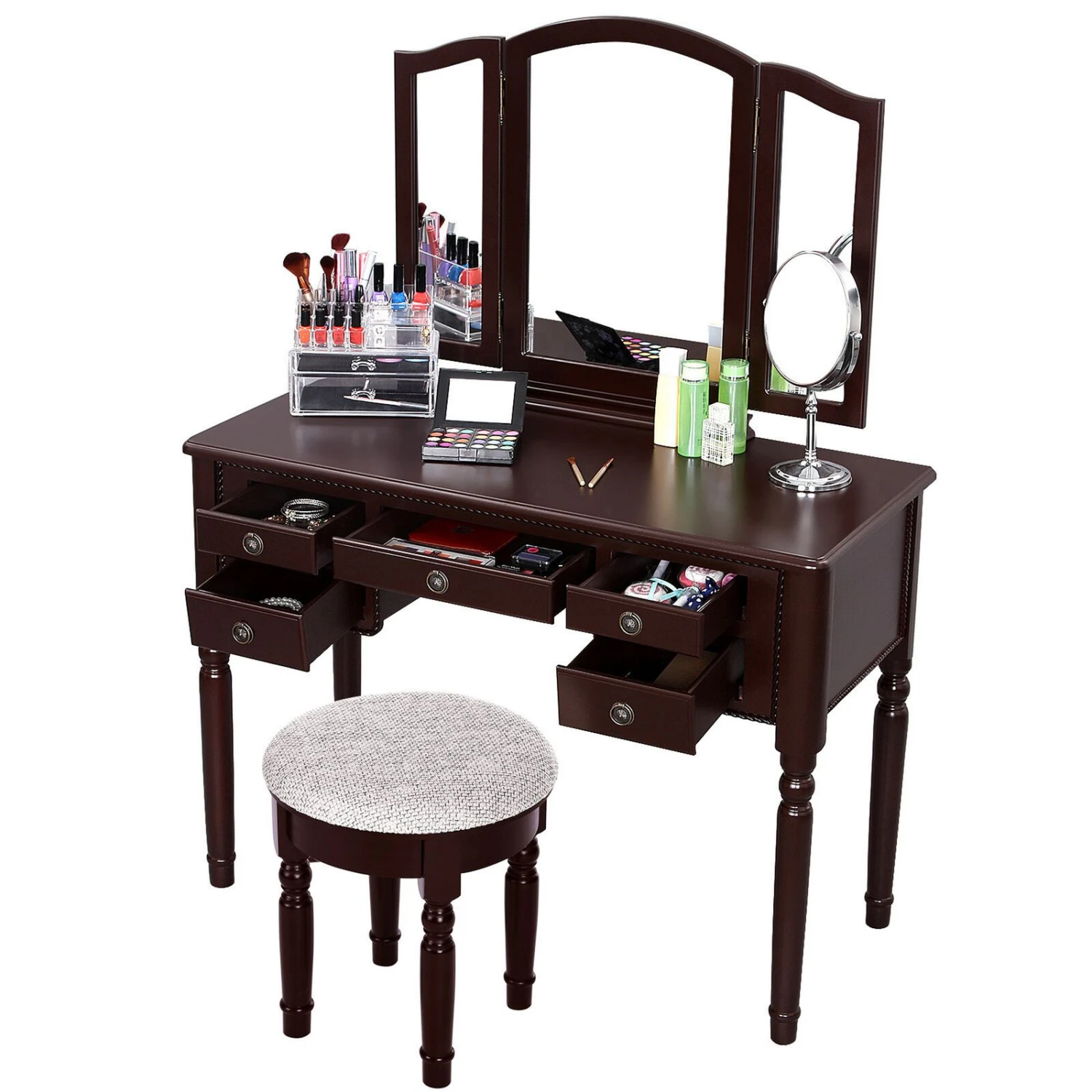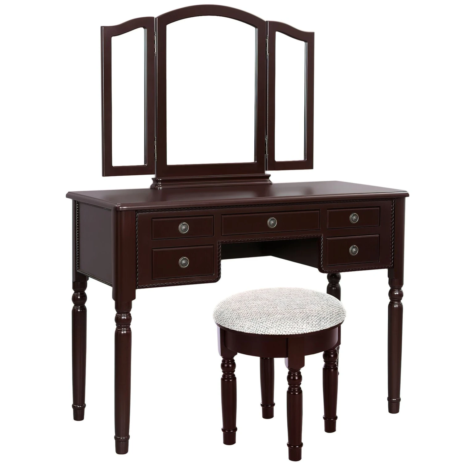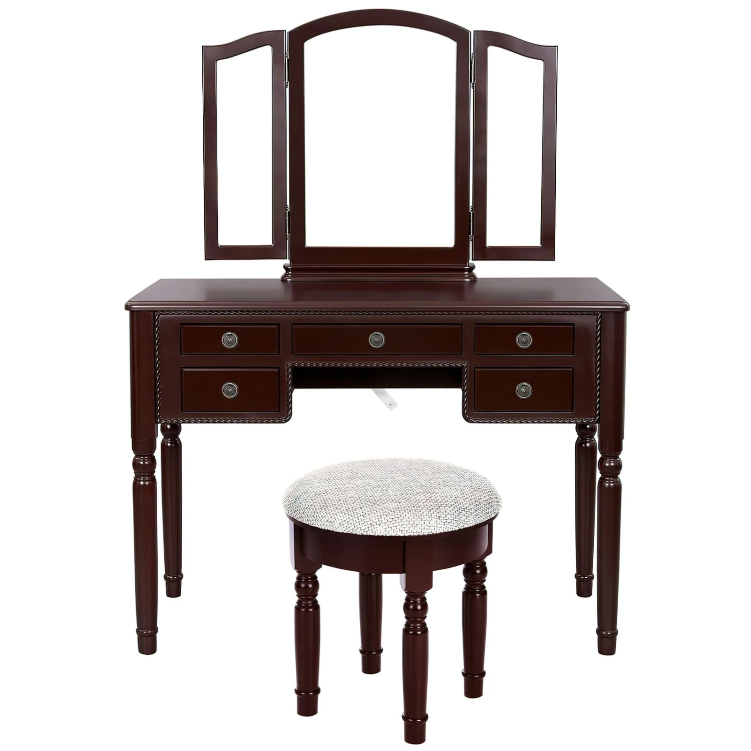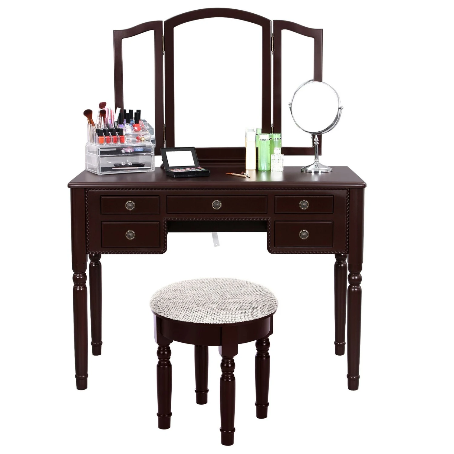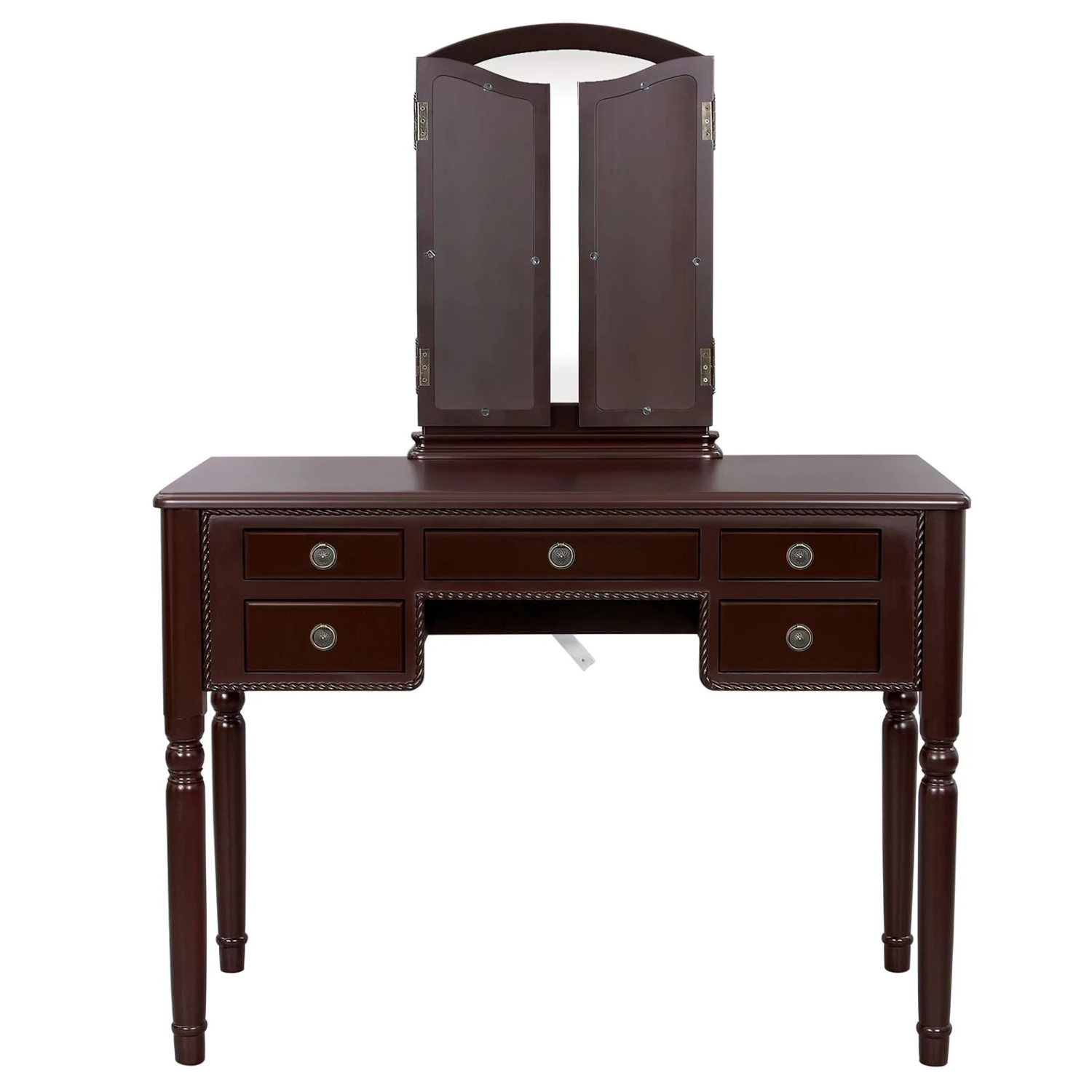 Light up your bedroom, walk in closet, or master bathroom in style and comfort with our luxurious espresso brown finished three piece vanity table set, including a trifold mirror and a luxuriously cushioned matching stool. Handcrafted from solid wood and a durable composite wood frame, the subtle twisted groove pattern adds an intriguing touch to this well made piece. Its tri fold mirror provide a full view so you can be sure to look great from every angle, and it opens and closes to keep it safe when out of use. The five smooth gliding drawers can keep your makeup essentials, accessories, and self care products neatly organized, and the round fixed stool cushined seat is incredibly comfortable and unobtrusive while you get ready. This tastefully classy set instantly upgrades the vibrancy of your decor setup. The vanity can be also used as a desk, as the mirror is removable.