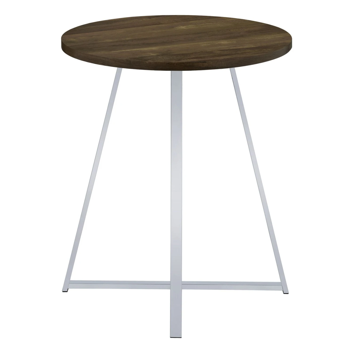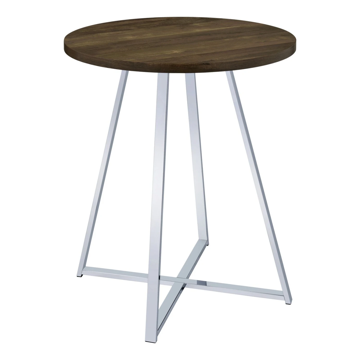 Add warmth and welcome to any bar or kitchen area with this beautifully stylish round bar table. Crafted with a durable brown particle board tabletop adorned with beautifully embellished wood grain details for an artistic and earthy look, this table comes set atop polished chrome metal legs for both stability and a visually striking sense of charm and contemporary brilliance.