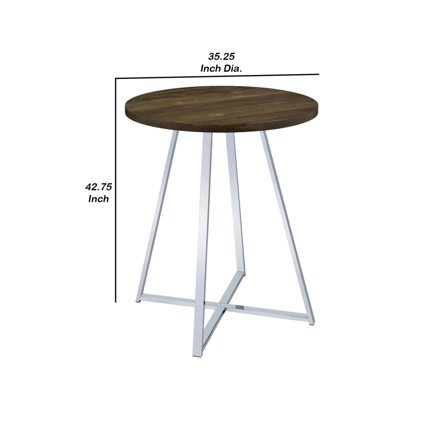43 Inch Tall Modern Bar Table, Brown Round Top, Polished Chrome Flared Legs-Benzara