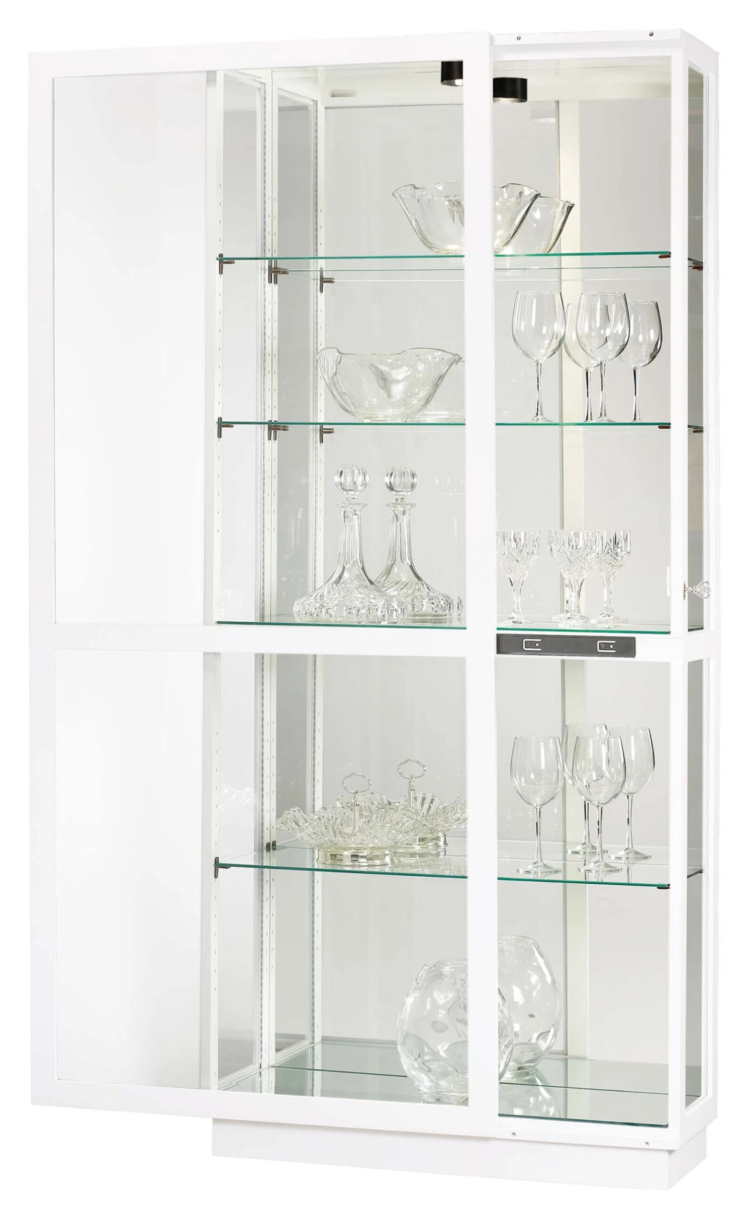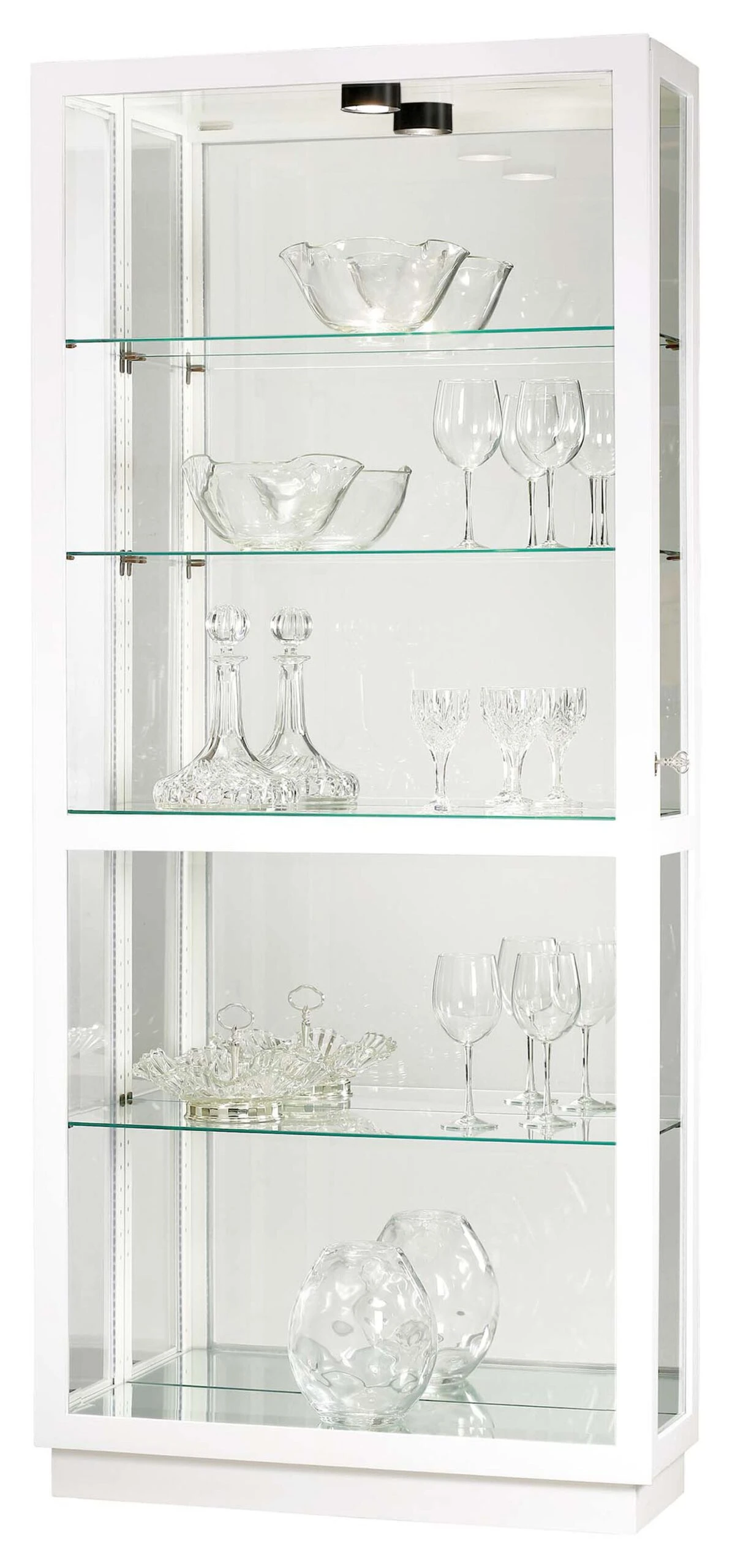 The Jayden IV Curio Cabinet by Howard Miller has a hand-rubbed gloss white finish. Beveled glass. Locking front slide door. No Reach roller light switch with LED lighting. Glass mirrored back. Four adjustable shelves, five levels of display. Pad-Lock metal shelf clips. Adjustable floor levelers. Made in the USA.