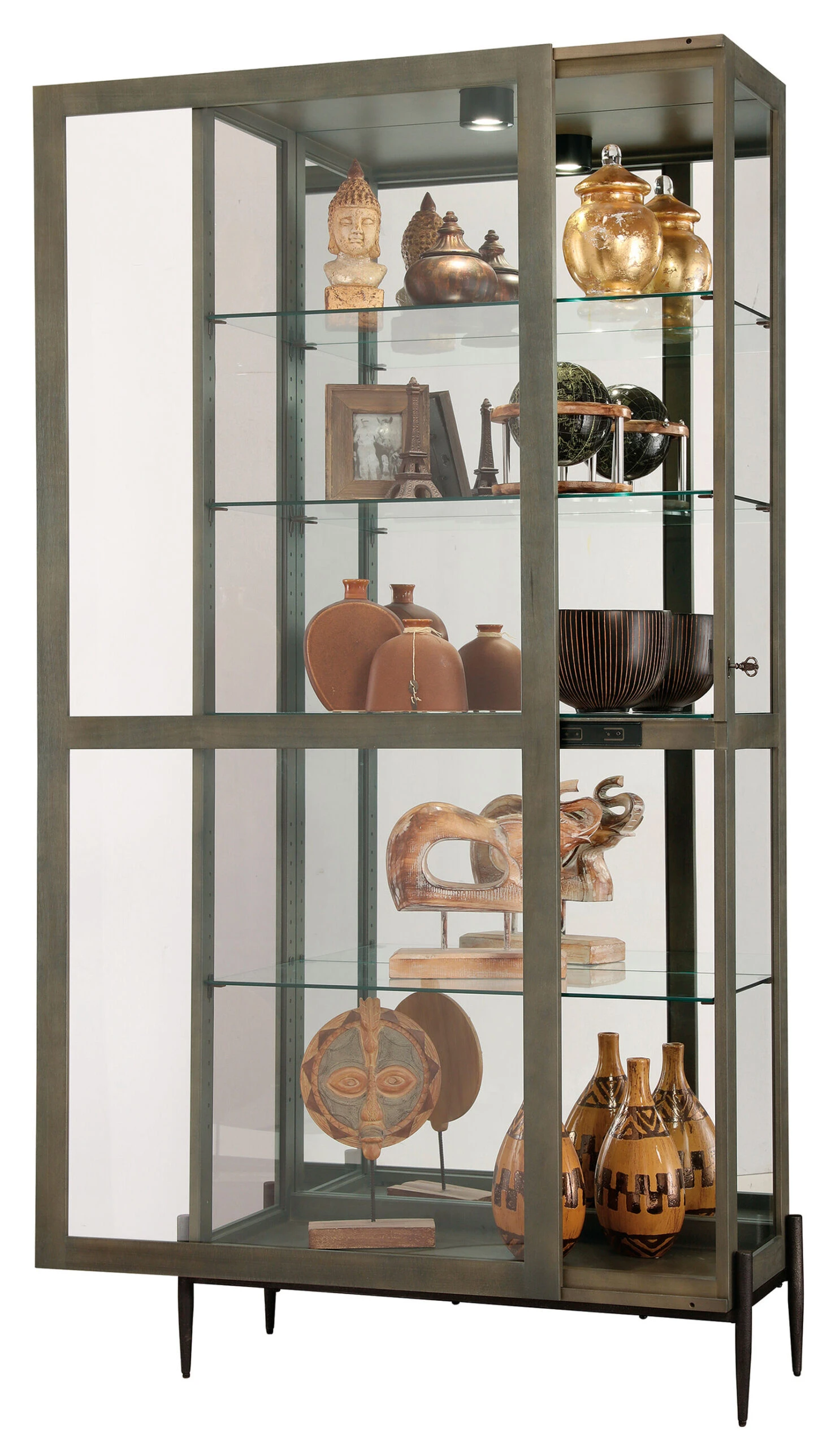 The Ansel II Curio Cabinet by Howard Miller has a Smoke Grey finish and is wire-brushed for a natural, reclaimed wood appearance. Hand-forged lightly distressed iron leg base. Two-way locking slide door. Glass mirrored back. Four adjustable glass shelves for five levels of display. No Reach roller LED light switch. Pad-Lock cushioned metal shelf clips. Adjustable levelers. Made in the USA. Some assembly required.
