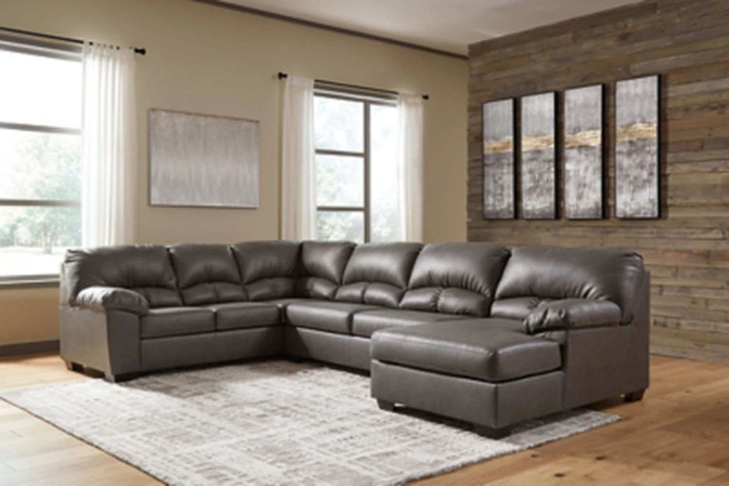 Indulge your lust for comfort and love for contemporary design with this sectional in gorgeous gray. Made for easy, everyday living, it’s upholstered in a heavyweight padded faux leather, accented with contrast jumbo stitching for fashion-forward flair. Divided back design puts pillow plushness and support right where it’s needed most. Overstuffed pillow top armrests are the stuff dreams are made of.