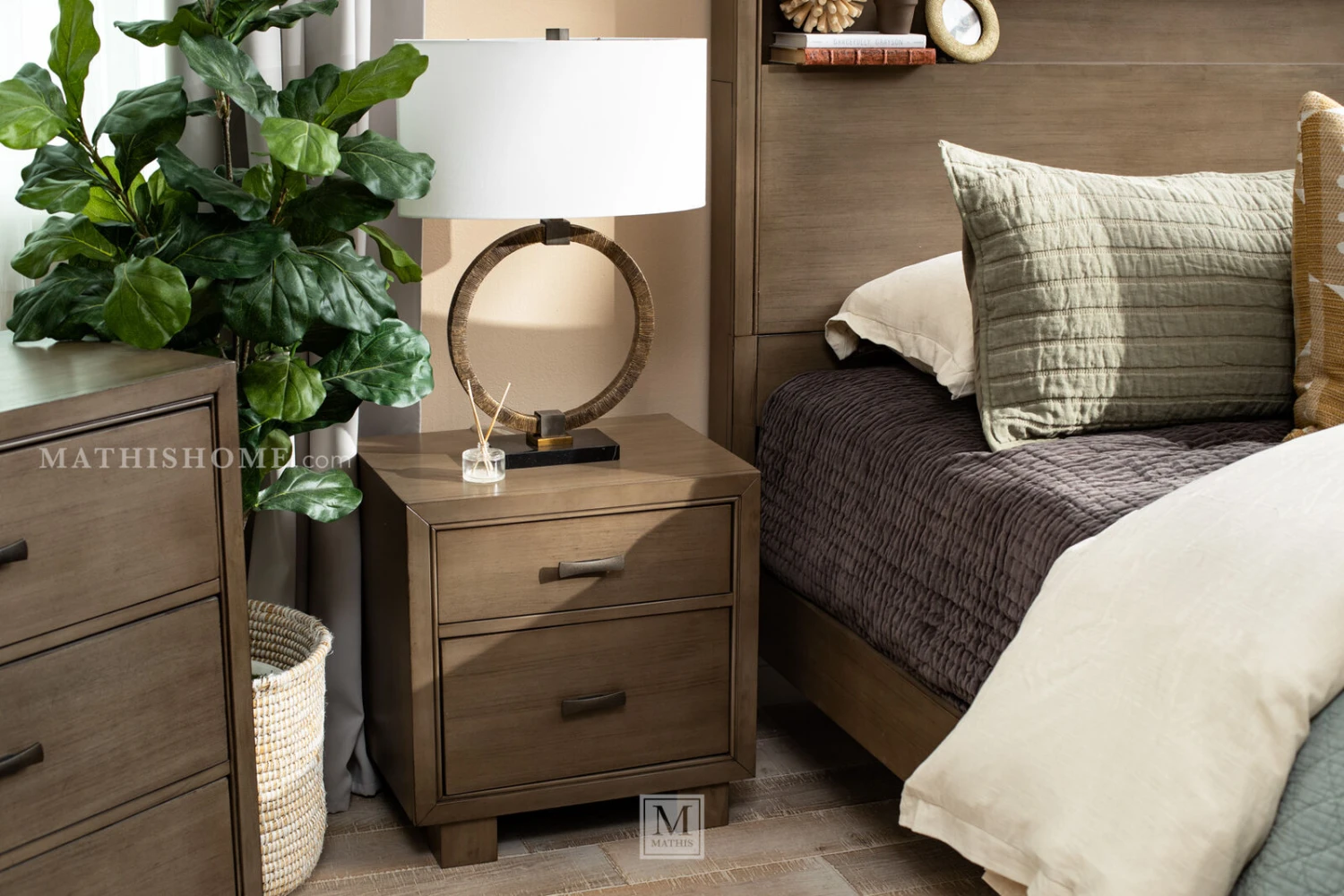 Melding modern and mid-century influences, this nightstand brings a fashion-forward perspective to bedroom furniture. The nightstand’s ultra-clean lines, including flush-mount drawers and bold, blocky feet, are beautified with a smoky gray finish that’s delightfully distinctive. Chunky bar pulls in a satin nickel-tone finish are a brilliant touch.