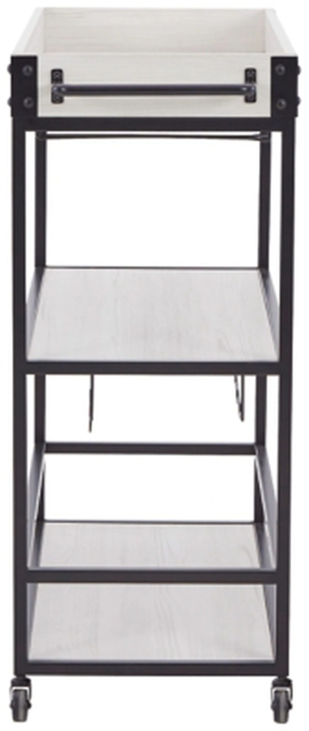 Impress your party guests in style with this bar cart. A whitewash finish keeps the top tray shelf and two lower shelves looking crisp. A stemware rack holds wine glasses with ease, while a slim rack on the bottom shelf holds wine bottles for sleek storage. Smooth-gliding casters provide easy mobility.