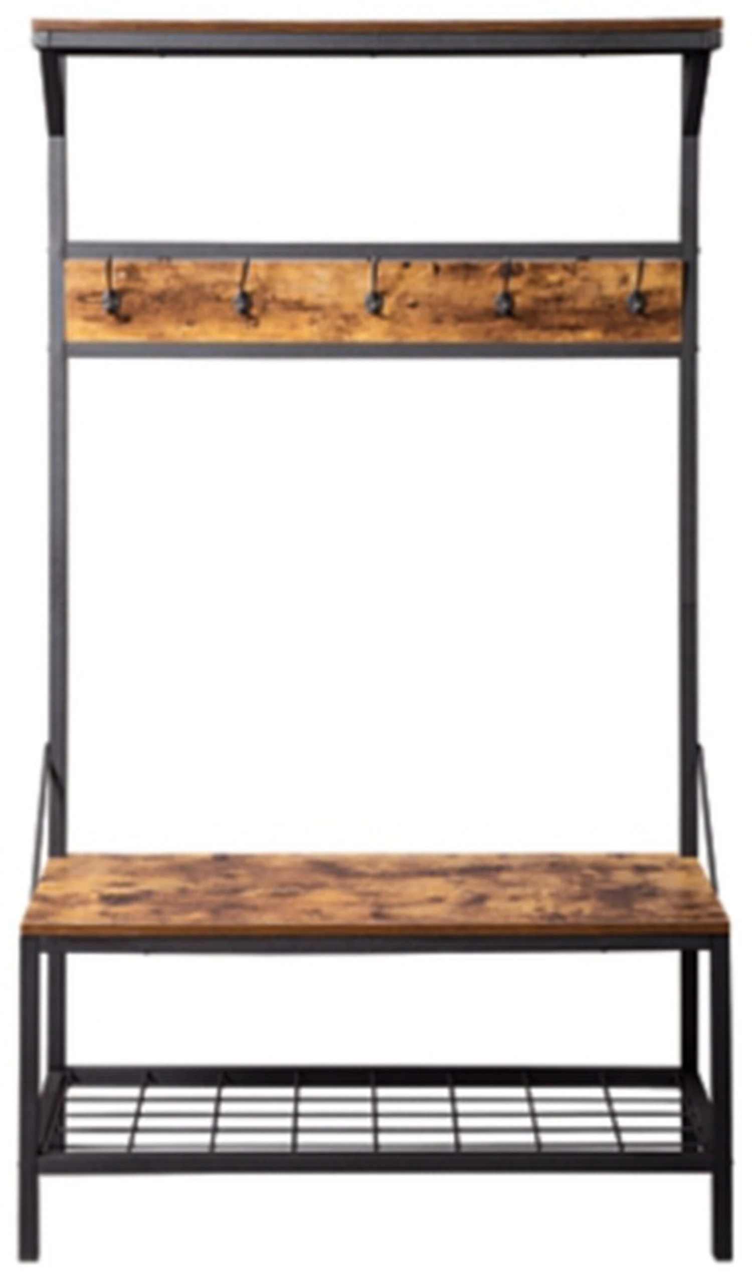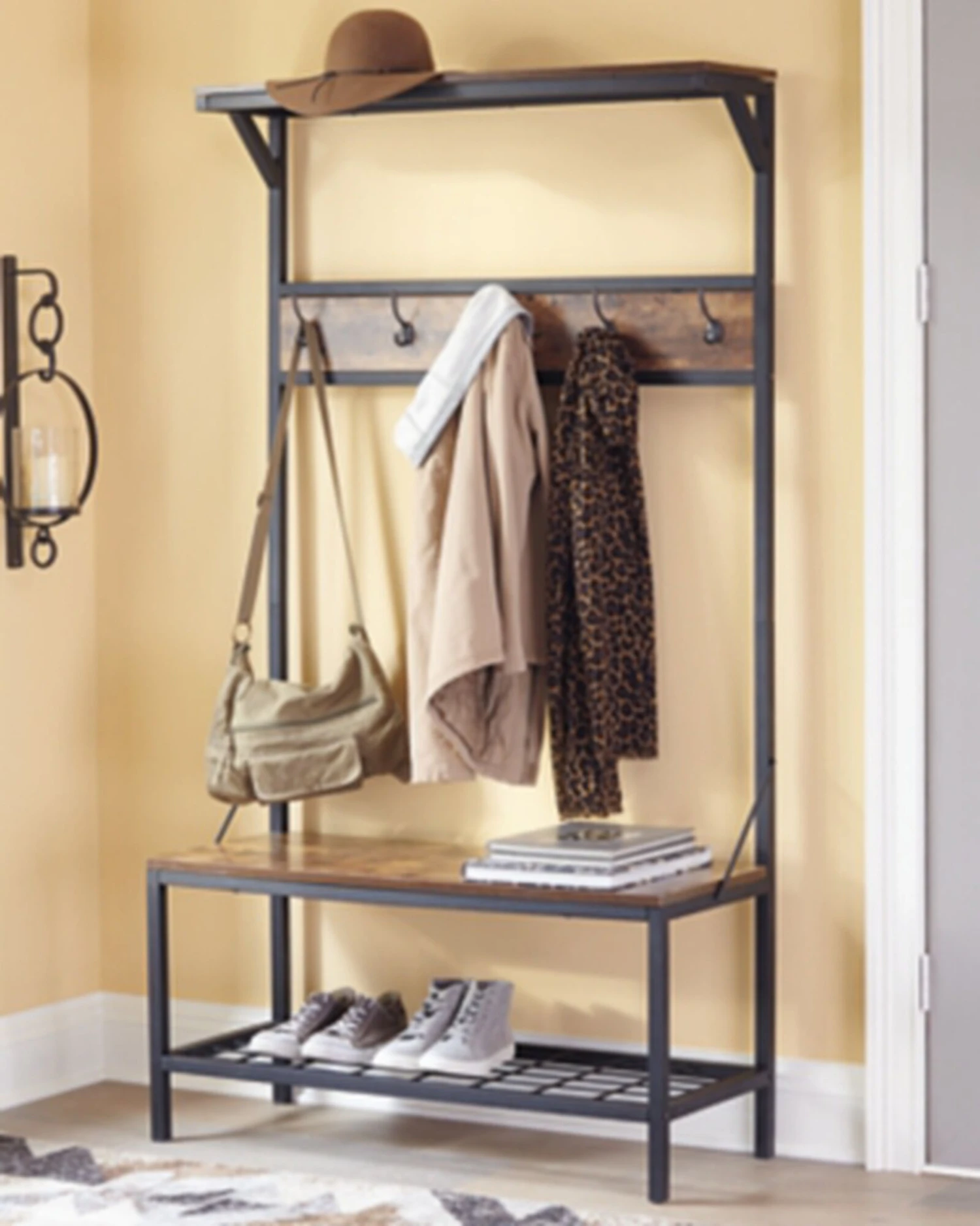 The rugged good looks of this hall tree were inspired by vintage pieces from yesteryear. Upper and lower shelves offer convenient storage and display space for belongings and baskets. The warm wood tone and black metal frame merge weathered character with a modern edge. Substantial seat makes urban industrial style look wonderfully welcoming.