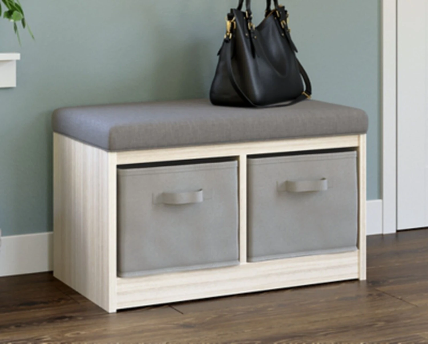Sit and store in style. This storage bench is topped with a cool gray cushion for a soft touch. Its removable fabric baskets are perfect for storing cold-weather essentials or keeping clutter under wraps. A light tan finish cleanly completes the look. Works wonders in your child’s bedroom or play space.