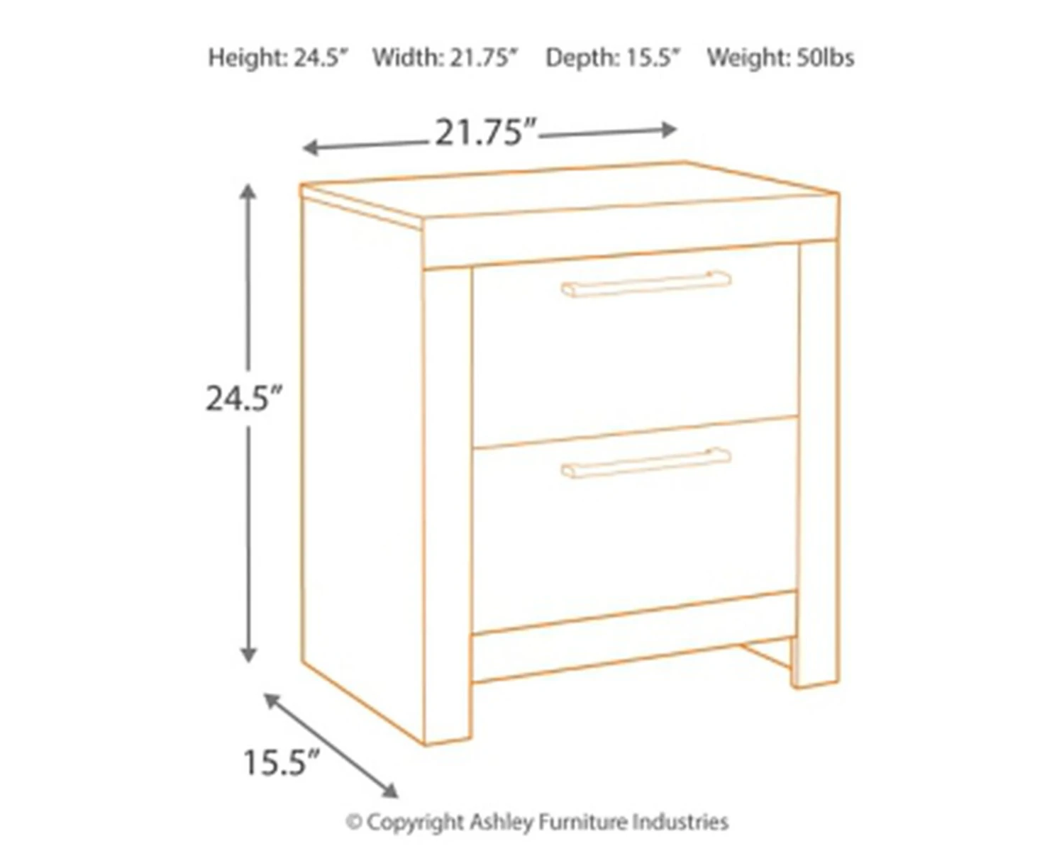 Modern yet hefty. This nightstand makes an urban eclectic statement. Seasoned raw wood look merges with the clean lined design we love today. Muted rustic finish over replicated pine grain maintains its authenticity. Roomy drawers are flanked with attractive framed front and pilasters. Handles with antiqued gunmetal finish complete this beauteous look with easy to pull function.