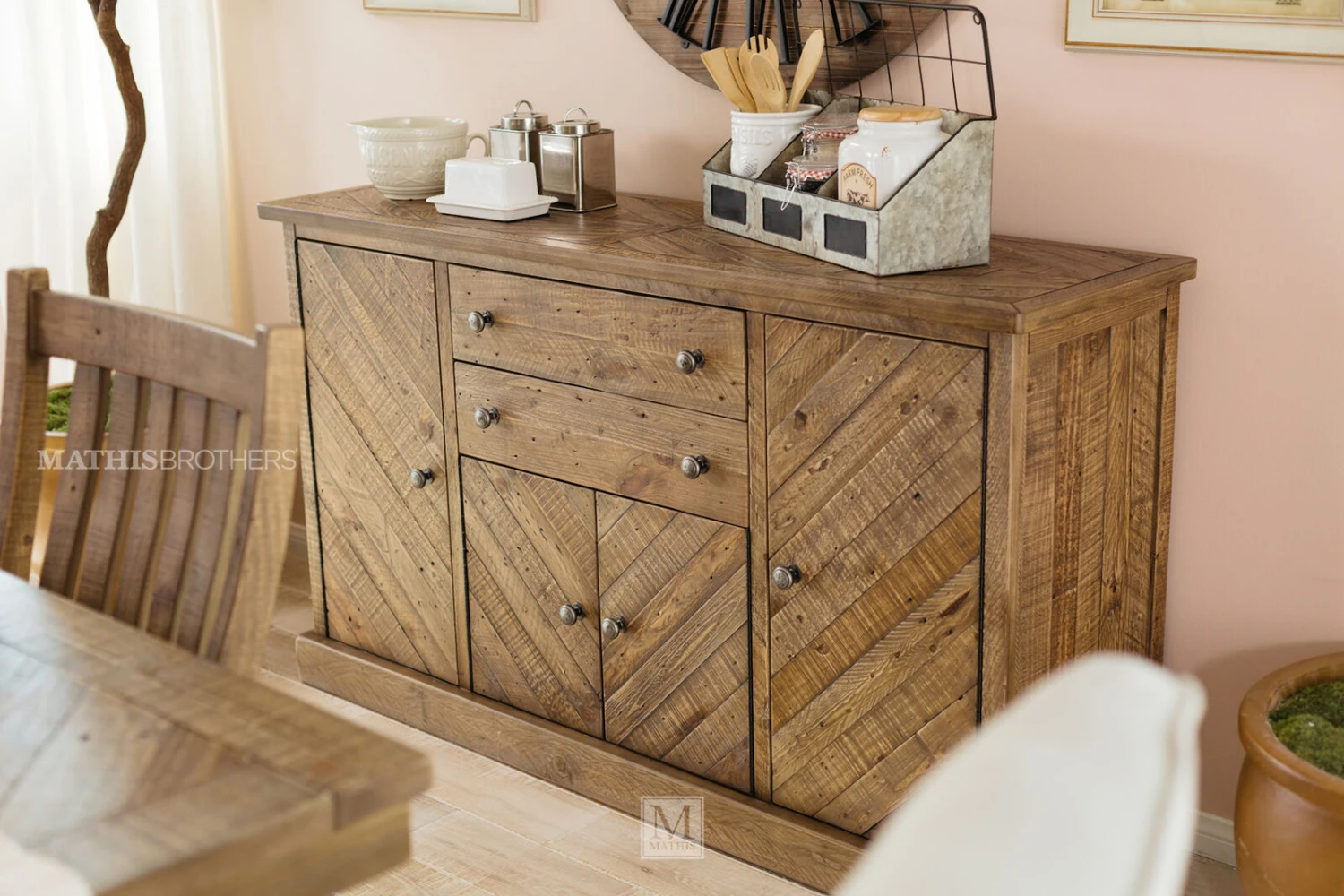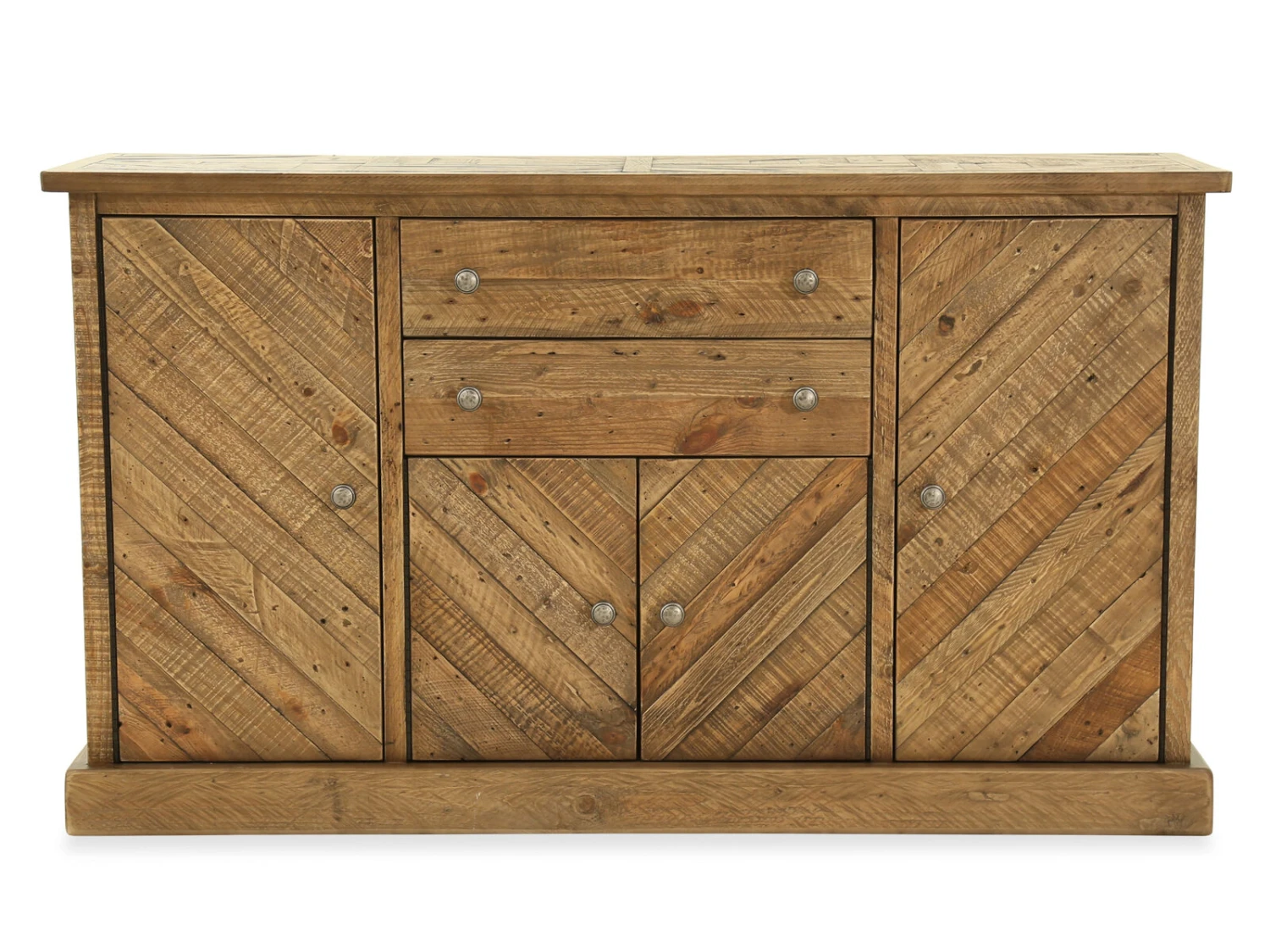 This dining room server is a well-made modern farmhouse piece. Designed with reclaimed pine wood, it pays homage to natural materials. It is punctuated with a splendid two-tone chevron pattern on the front and top, adding plenty of earthy tones. Drawers and doors are adorned with aged pewter-tone knobs. Ample storage space makes this server as functional as it is gorgeous.