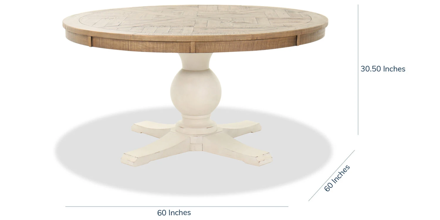 Experience the warm and unpretentious character of cottage charm with the Grindleburg Dining Table. It offers a great spot to hang out or have meals with family or friends in your dining room. Constructed from reclaimed pine wood with inlays on the top for a plank effect, it brings a touch of cottage chic to your interior. The dual finish of white on the pedestal and earthy brown on the top creates a balanced aesthetic.