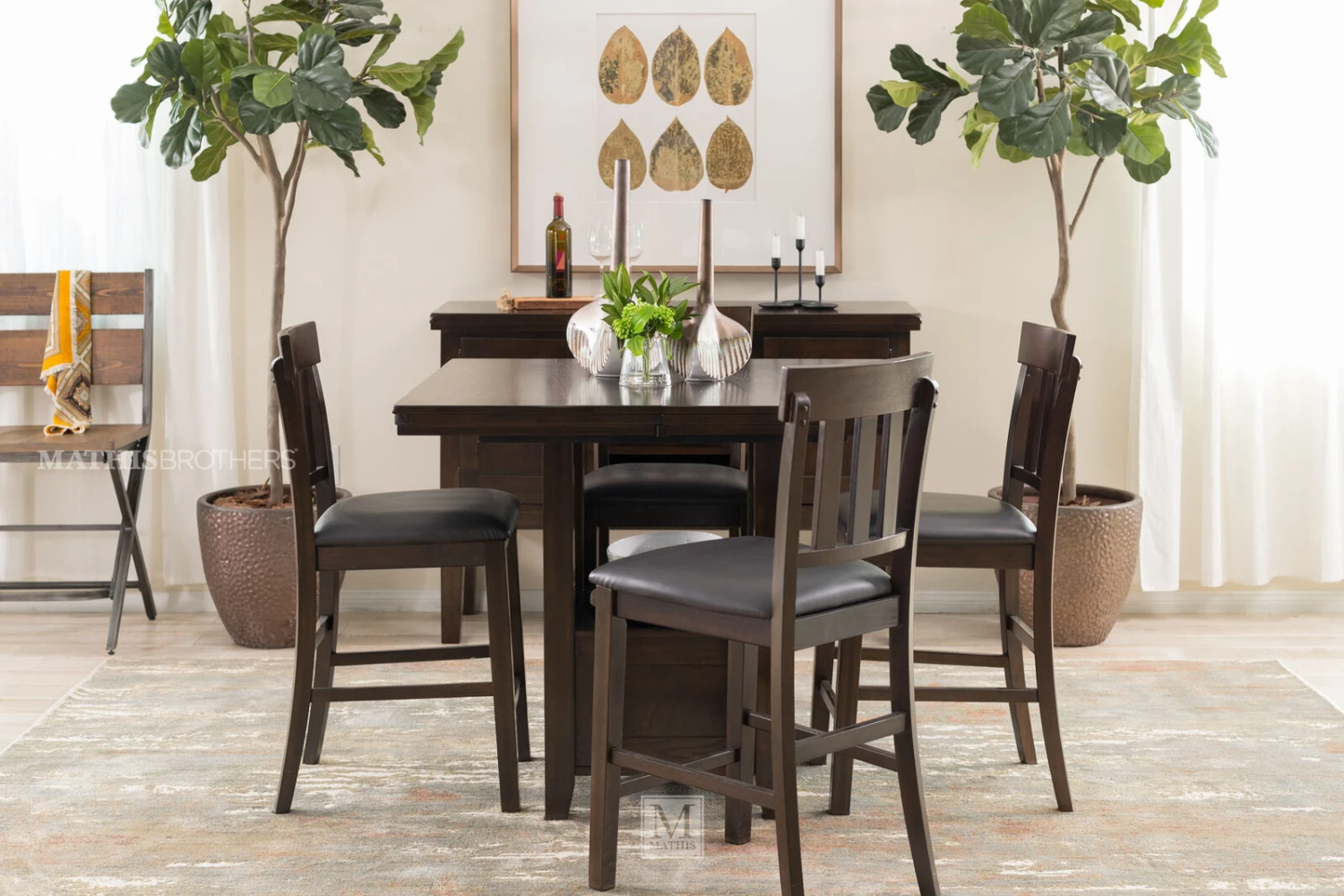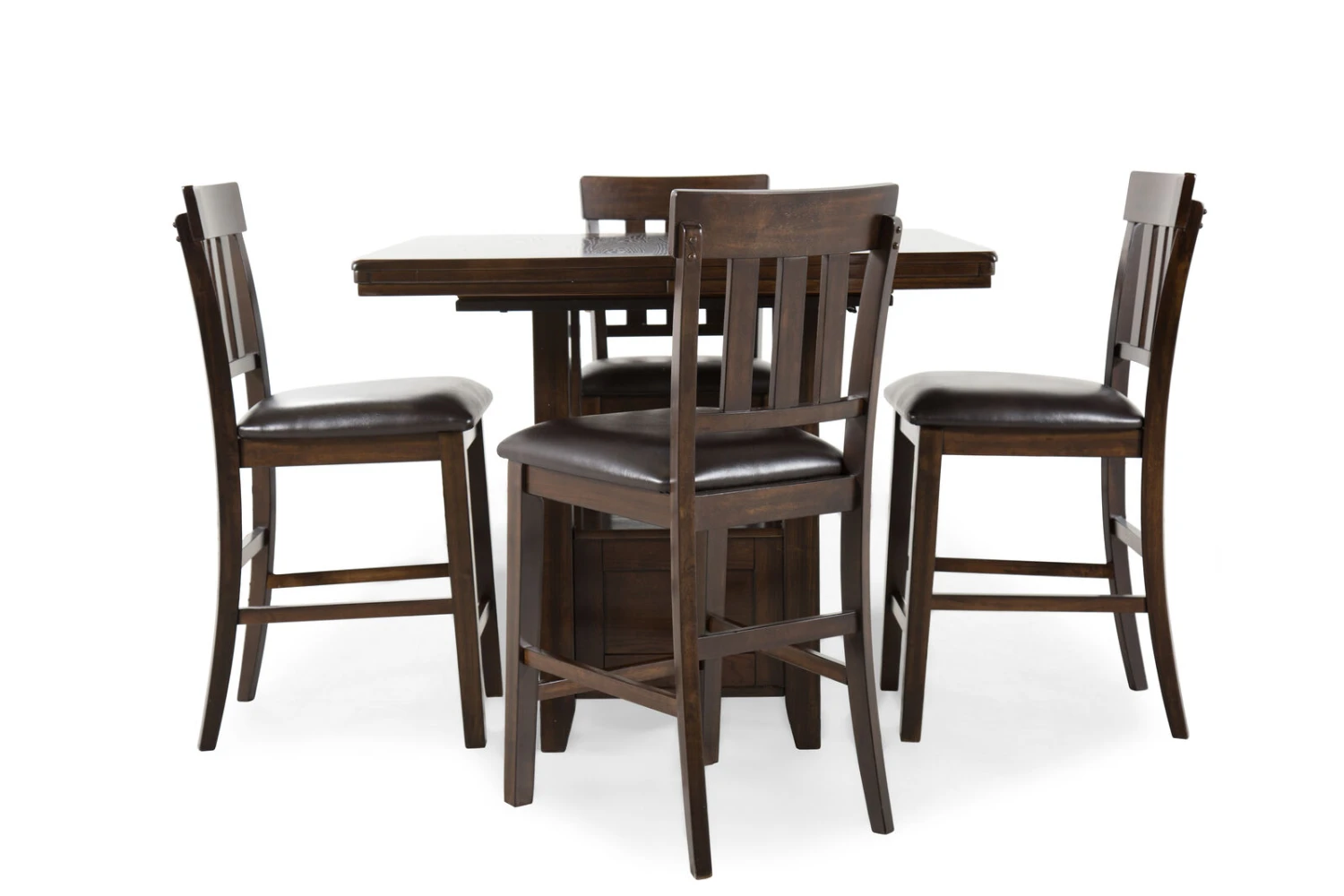 The Haddigan 5-Piece Counter Height Dining Set is made with select hardwood and oak wood veneers in an unusual distressed smoky dark brown finish. The table included in this pub set has a square top supported by four straight, square legs with tapered ends, flanking large, convenient storage. The counter stools have a slatted, contoured back and a cushioned seat covered in dark chocolate brown performance leather.