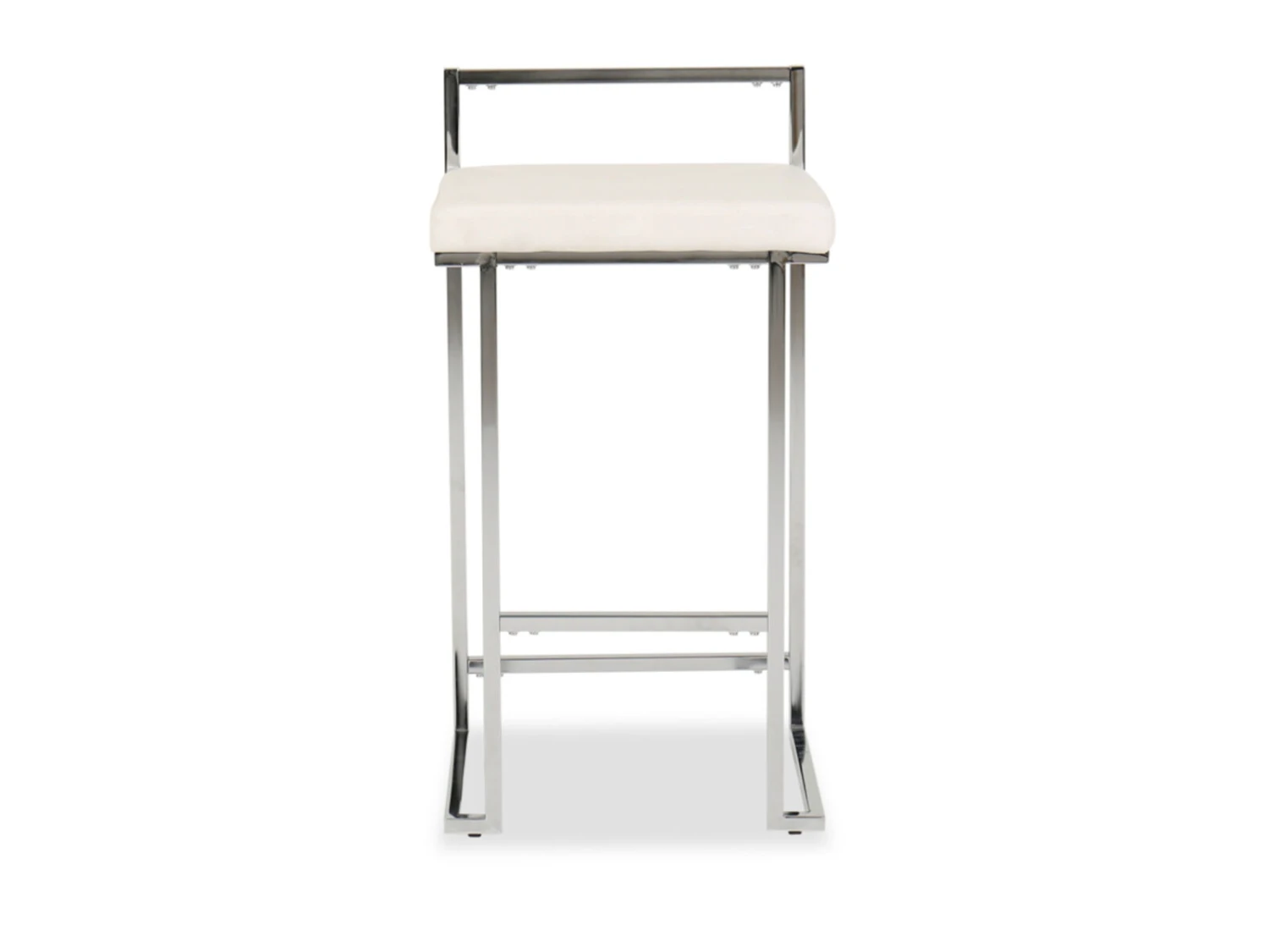 Your dining space wins a lottery in both aesthetics and function when you add this Madanere Barstool in White. Its open, minimal metal frame in shiny chrome topped by soft faux leather upholstered seat perfectly captures the sleek ultra-contemporary persona. Place this barstool in your kitchen or home bar to create a hangout spot, where you can catch up with your friends over a drink.