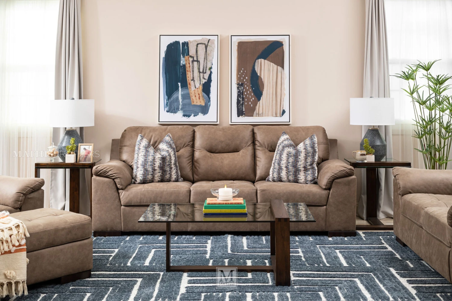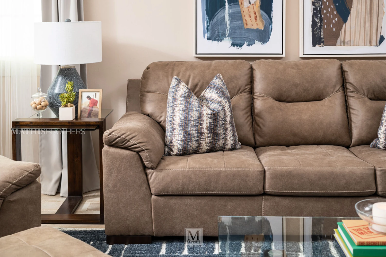 If you love the idea of a luxe look that won’t break the bank, make yourself comfortable with this alluring light-hued sofa in a neutral shade of pebble brown. Designed to look like the real thing, it’s wrapped in practical faux leather loaded with natural tonal variation and a soft hand feel. Appealing to a contemporary taste, its jumbo stitching, tufted styling and pillow top armrests are indulgently comfortable, with a streamlined look that tops off the high-end aesthetic made for everyday living.