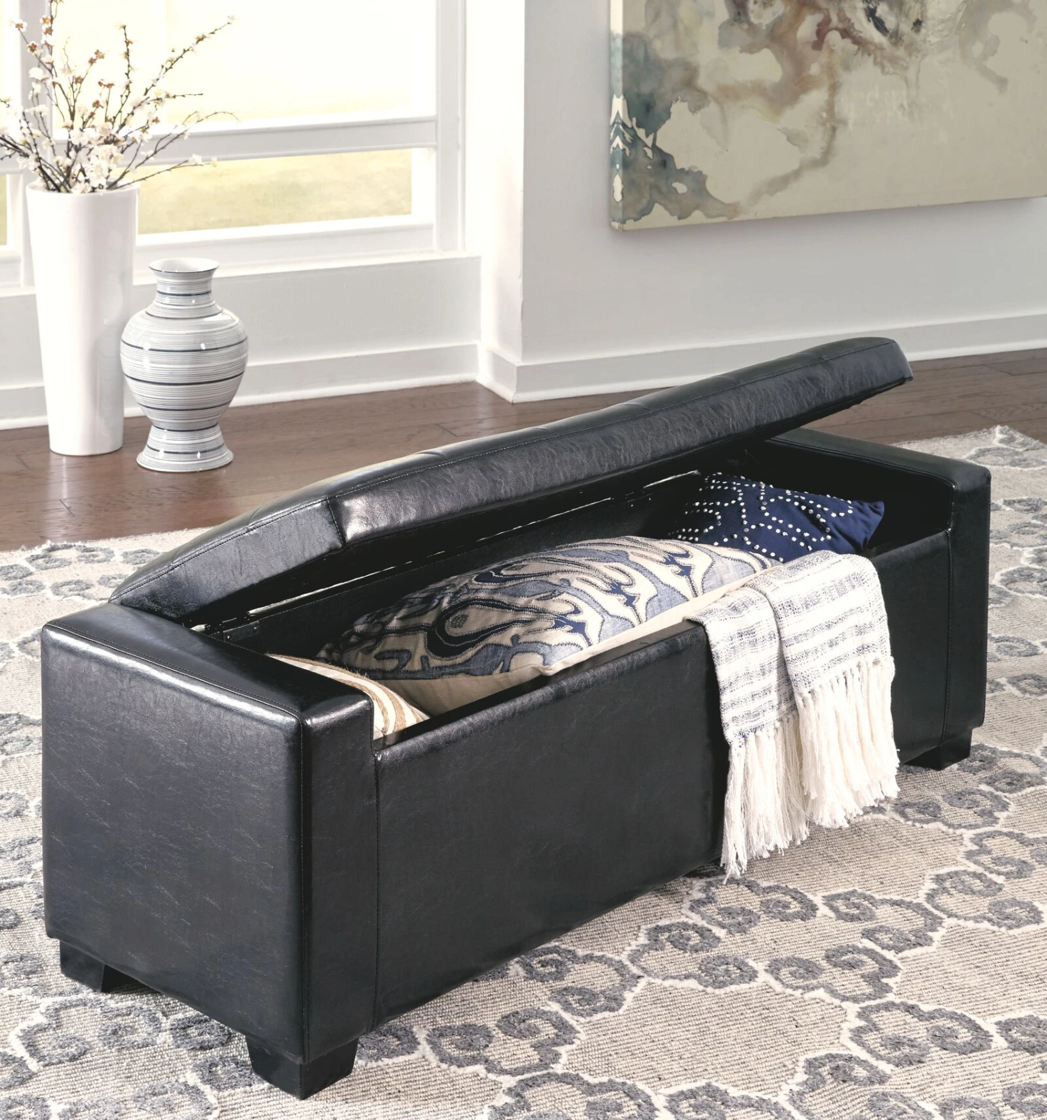 What a handsomely tailored upholstered storage bench. Black faux leather upholstery is elevated with button tufting. Lift the cushion to reveal ample storage for your pillows, throws and more.