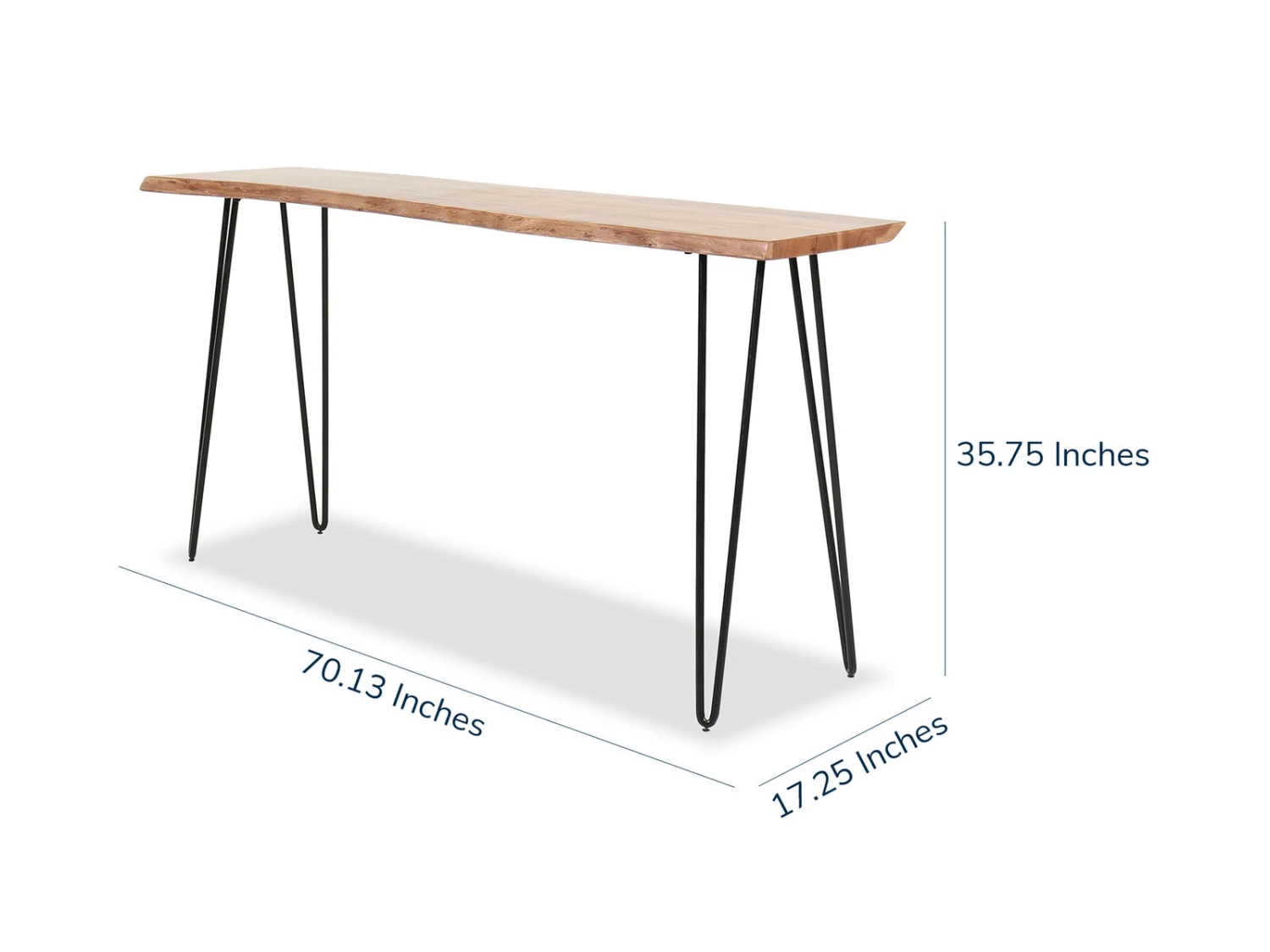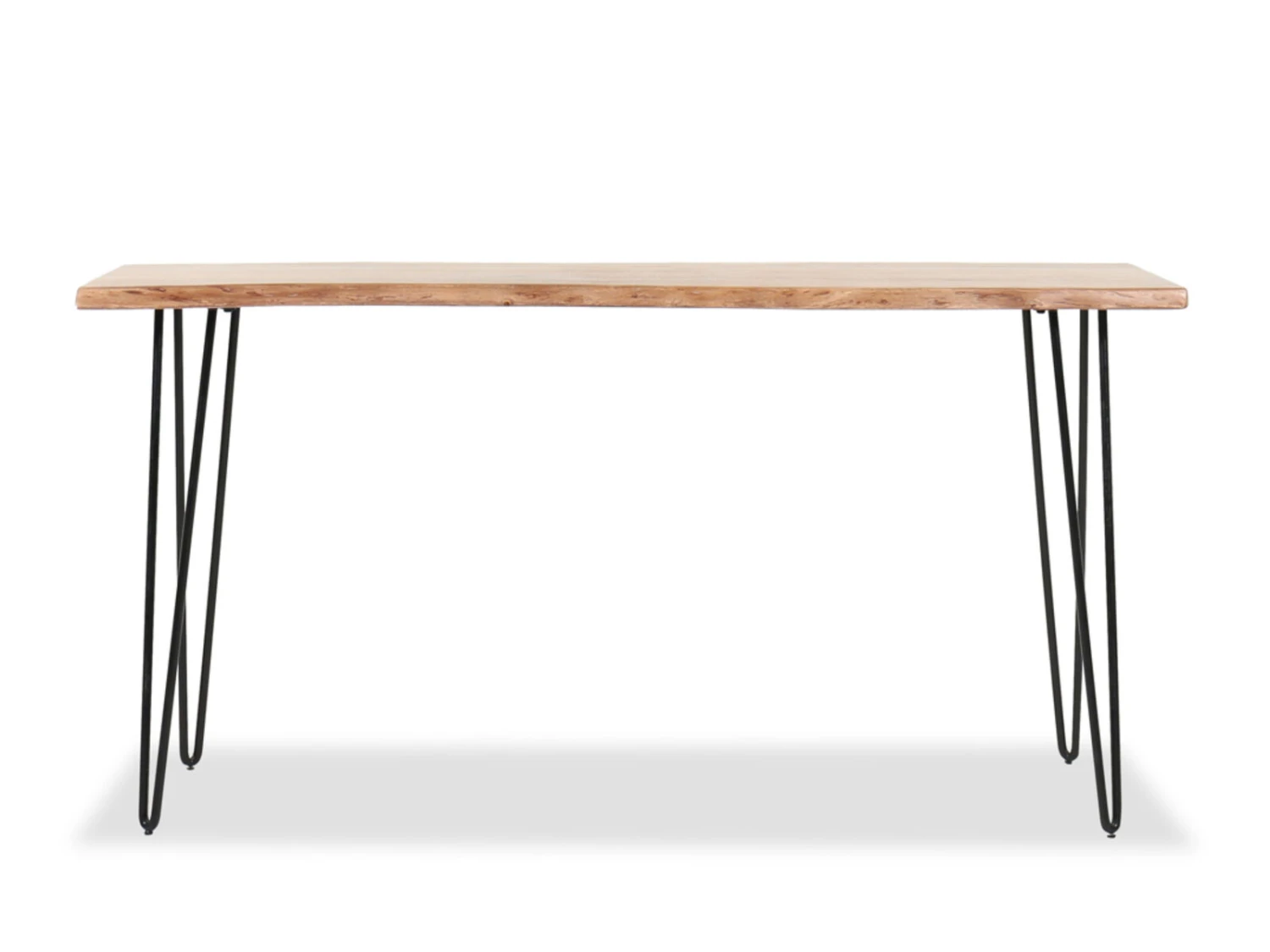 The stunningly simple Wilinruck solid mango wood dining table works effortlessly with contemporary decor. This narrow counter-height table is perfect for smaller dining spaces. Or for added function, place it behind a sofa or sectional to make the most of your family room. The tabletop’s gorgeous, natural-looking color contrasts nicely with the matte black metal legs, providing an instant upgrade to your space.