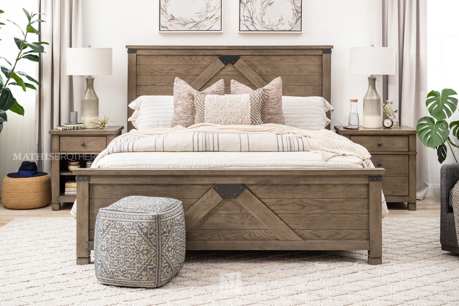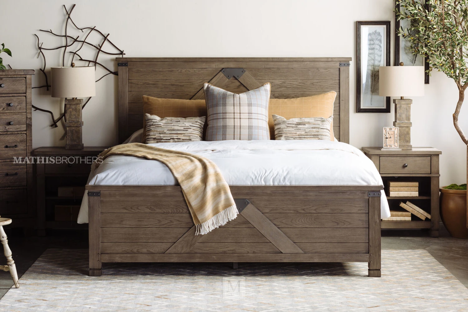 Revamp the style and function of your bedroom with this 60″ Queen Panel Bed in Stone. Constructed with rubber wood solids and white oak veneers for durability, this bed features gunmetal hardware accents that radiate a rustic aura. Two USB charging ports on each side of headboard ensure hassle-free gadget connectivity. A handsome stone finish greatly accentuates the cottage-inspired plank details of the Aspen Tucker Stone Queen Panel Bed.