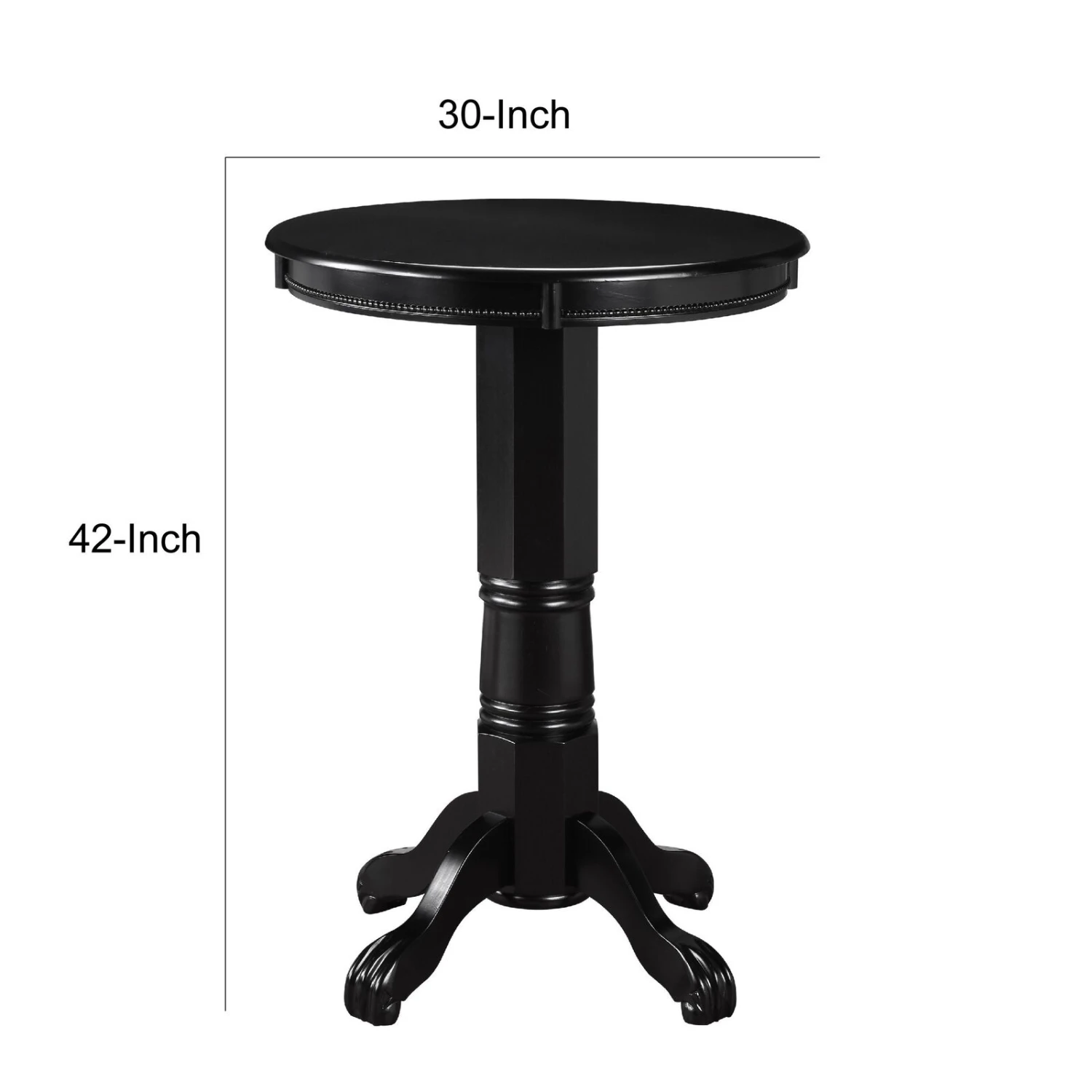 Ava 42 Inch Wood Pub Bar Table, Molded Trim, Carved Pedestal, Black- Benzara