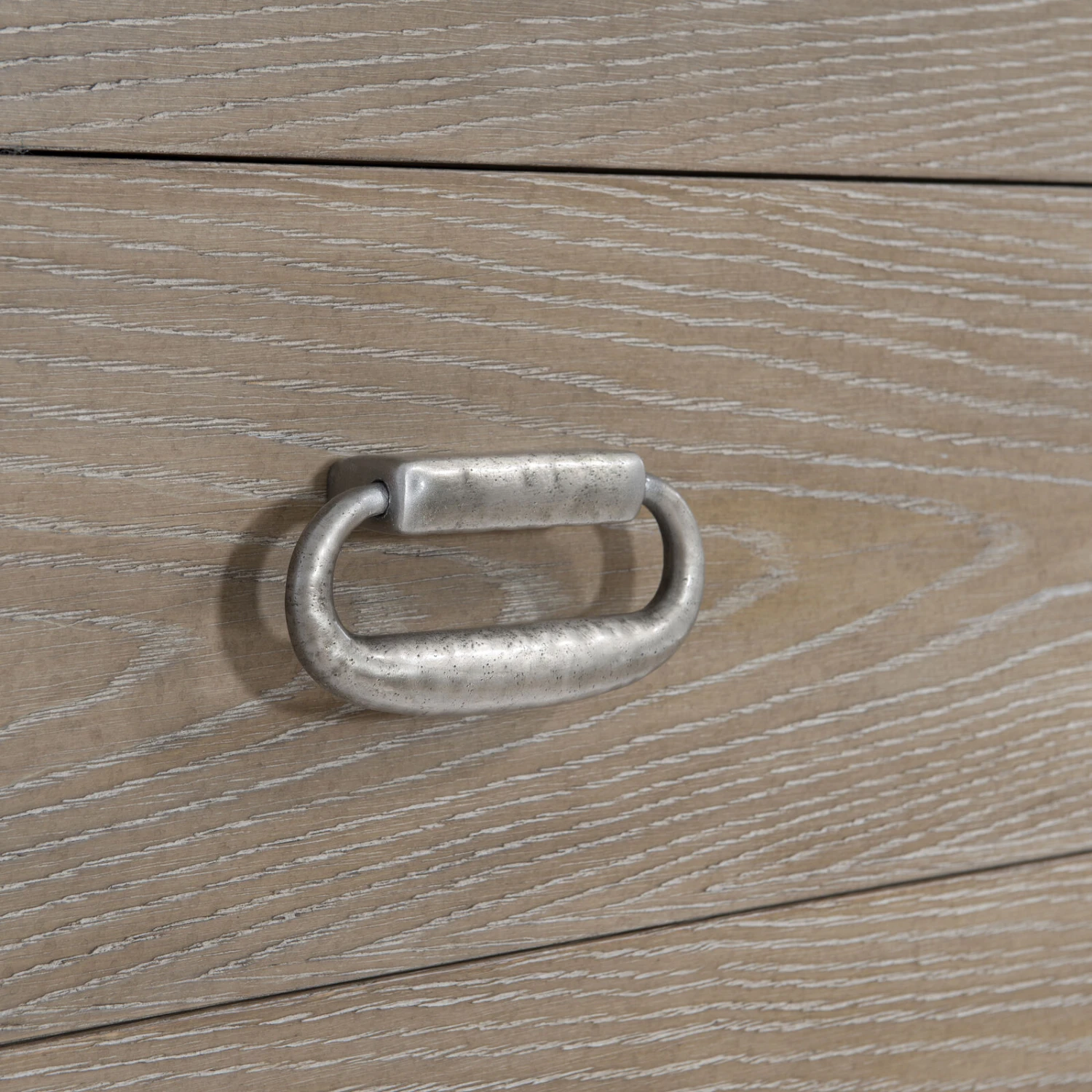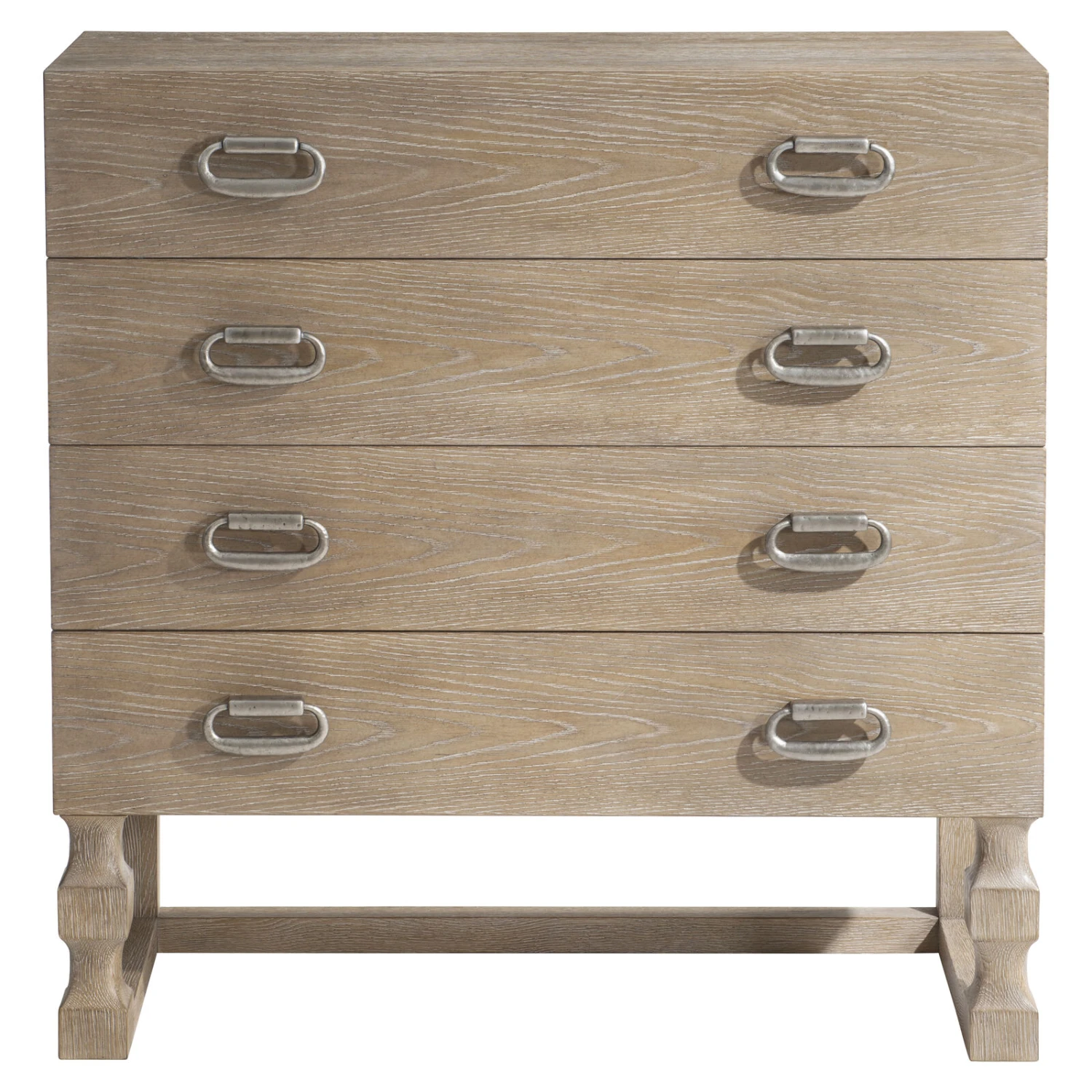 Bold hardware and the shine of textured metal highlights subtle geometric shaped legs on the Aventura tall drawer chest. Four soft-close drawers include metal drawer pulls, while the Marcona finish provides a warm and rustic look.