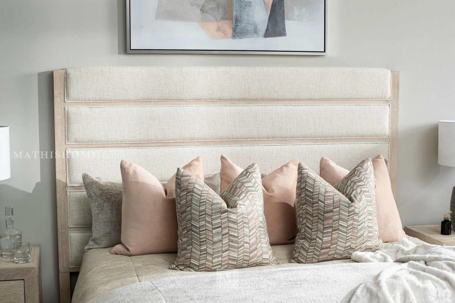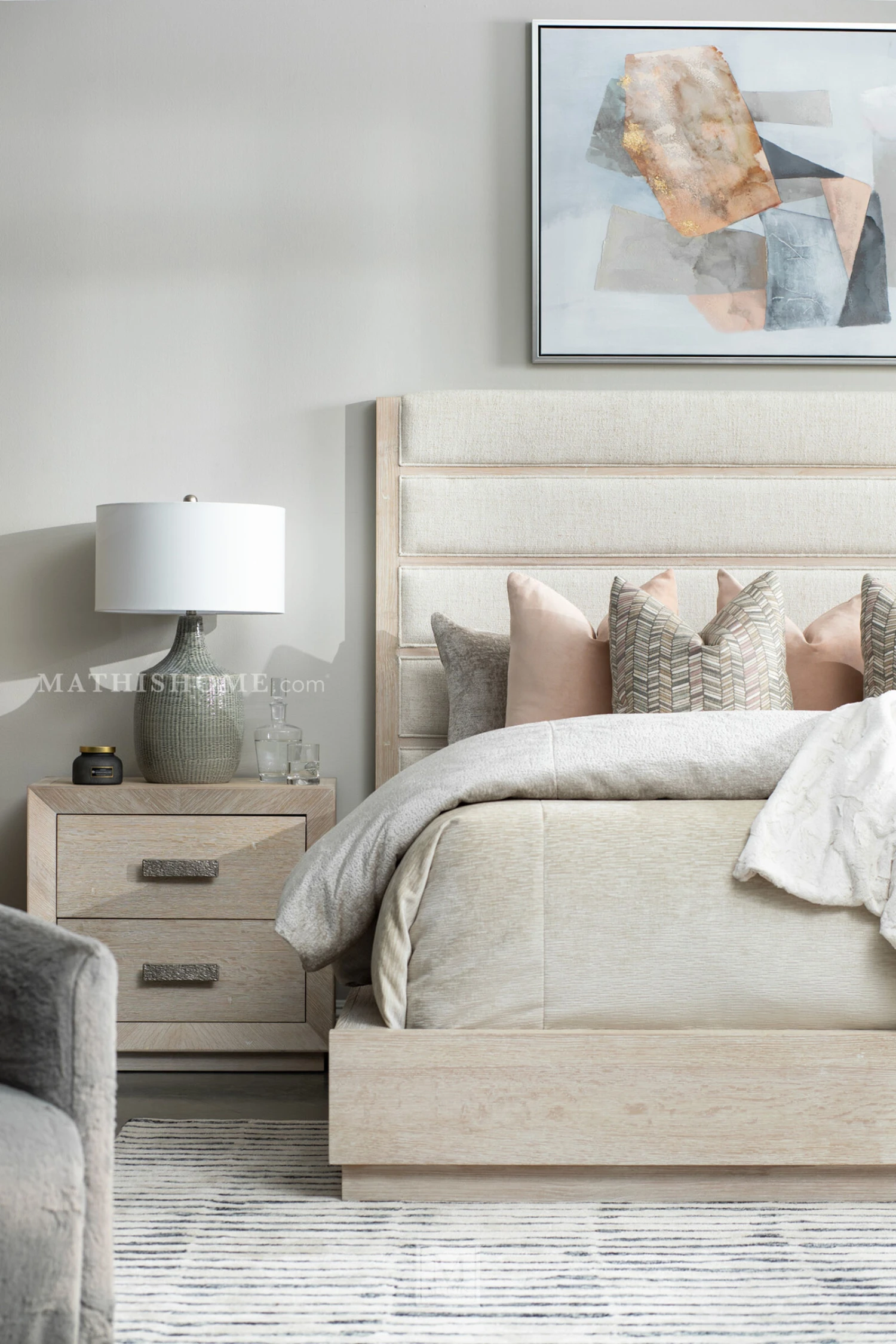 Bring elegance and unparalleled comfort to your sleep sanctuary with the Avery Cal King Panel Bed. This bed is lushly upholstered with soft fabric in an elegant beige tone, making it an excellent centerpiece in any contemporary-styled bedroom. Crafted with meticulous care, it features bolt-on rails, slats with support legs, and floor protectors for a seamless and secure assembly.