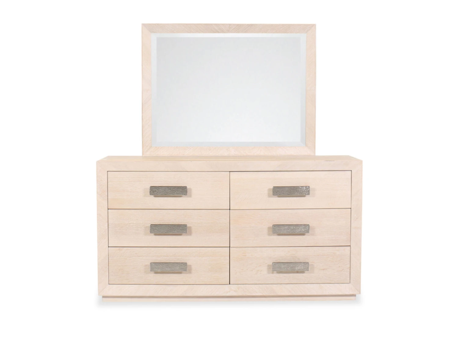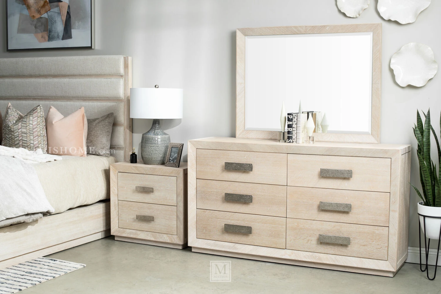 Elevate your master bedroom décor with the charm of this Avery Dresser & Mirror. Crafted from durable wood and finished in a charming light brown hue, this set not only enhances the room’s aesthetics but also adds practicality for daily grooming and dressing needs. The dresser features six spacious drawers that offer ample storage space for clothing and personal items. The mirror with a matching wooden frame complements the dresser’s contemporary style and enhances the overall functionality of this furniture set.