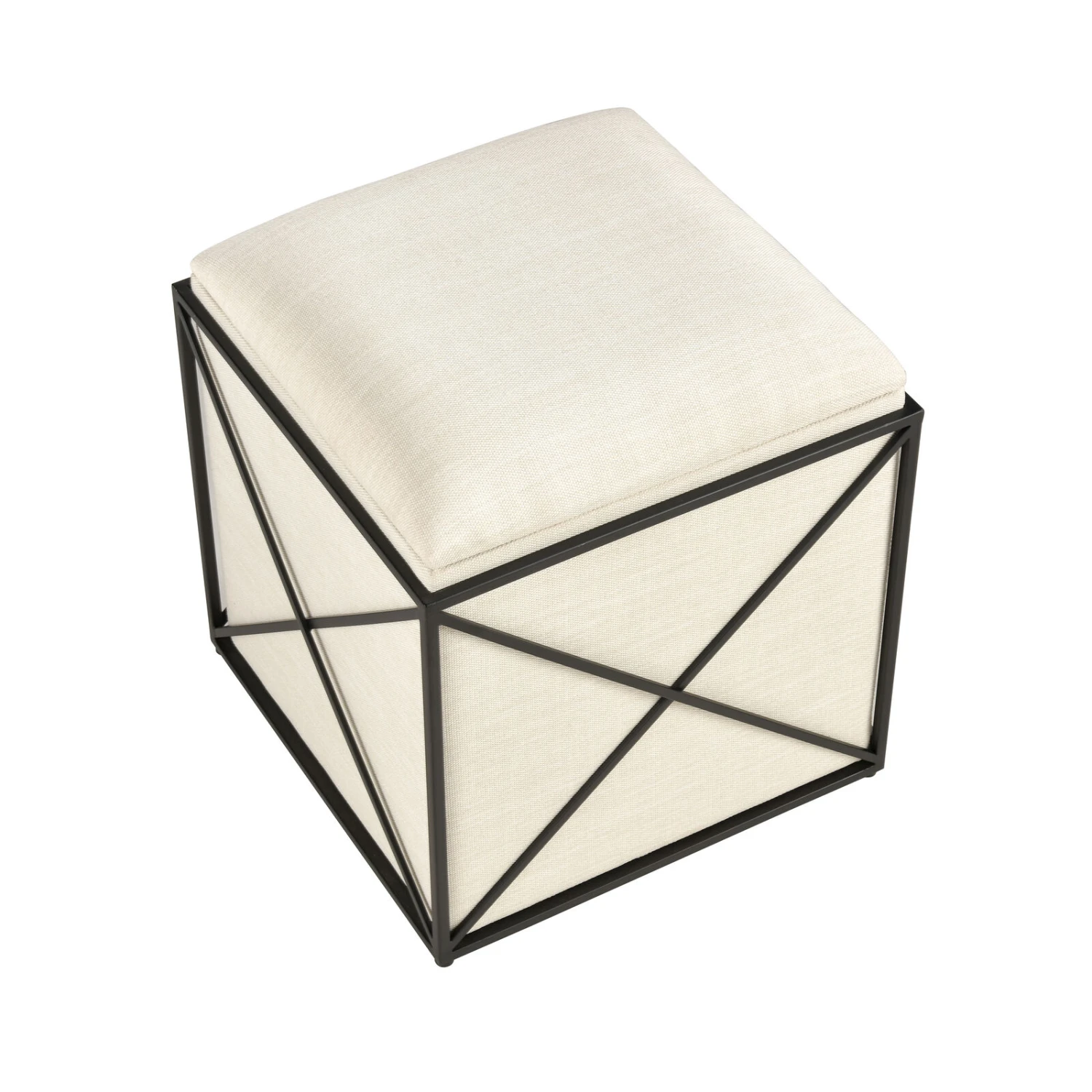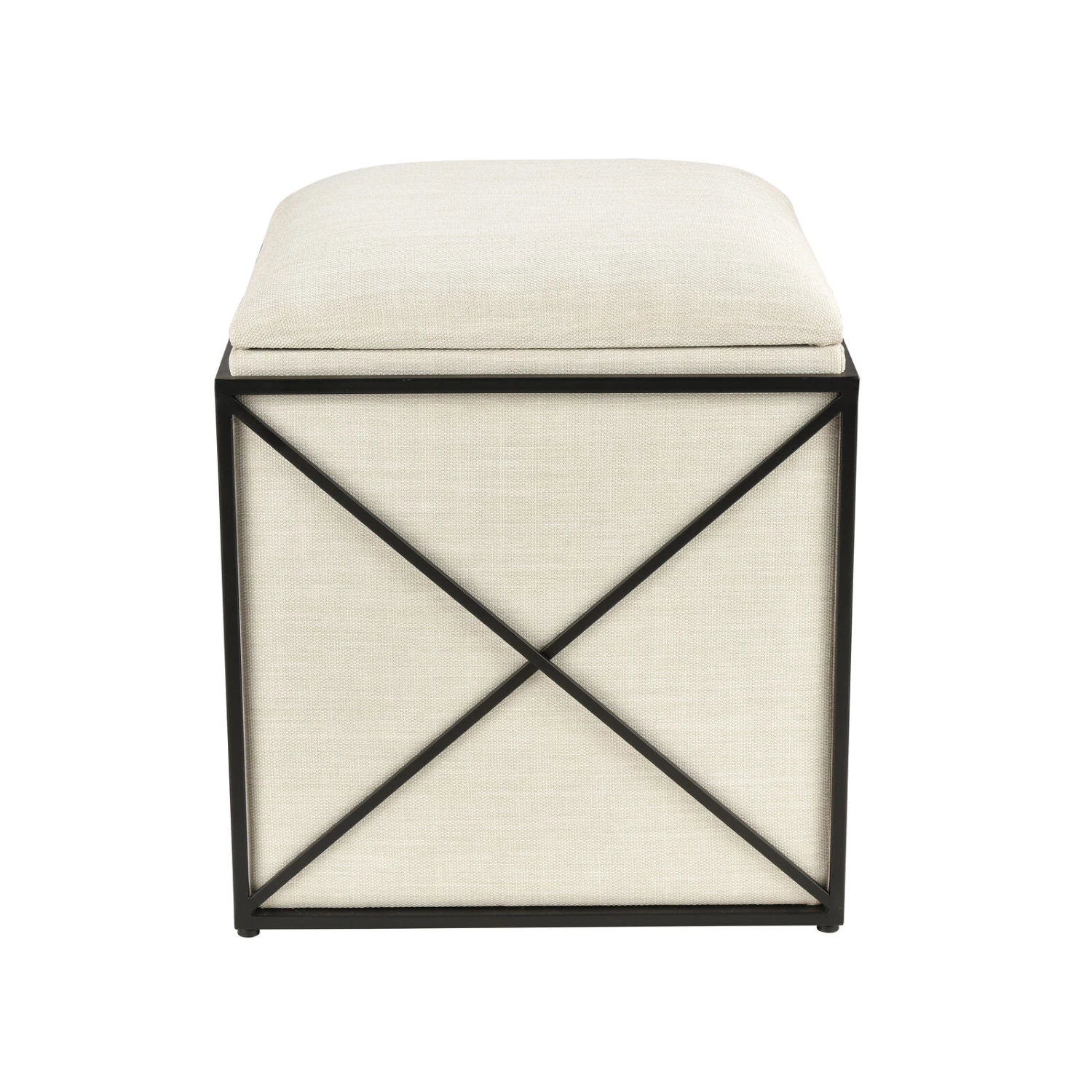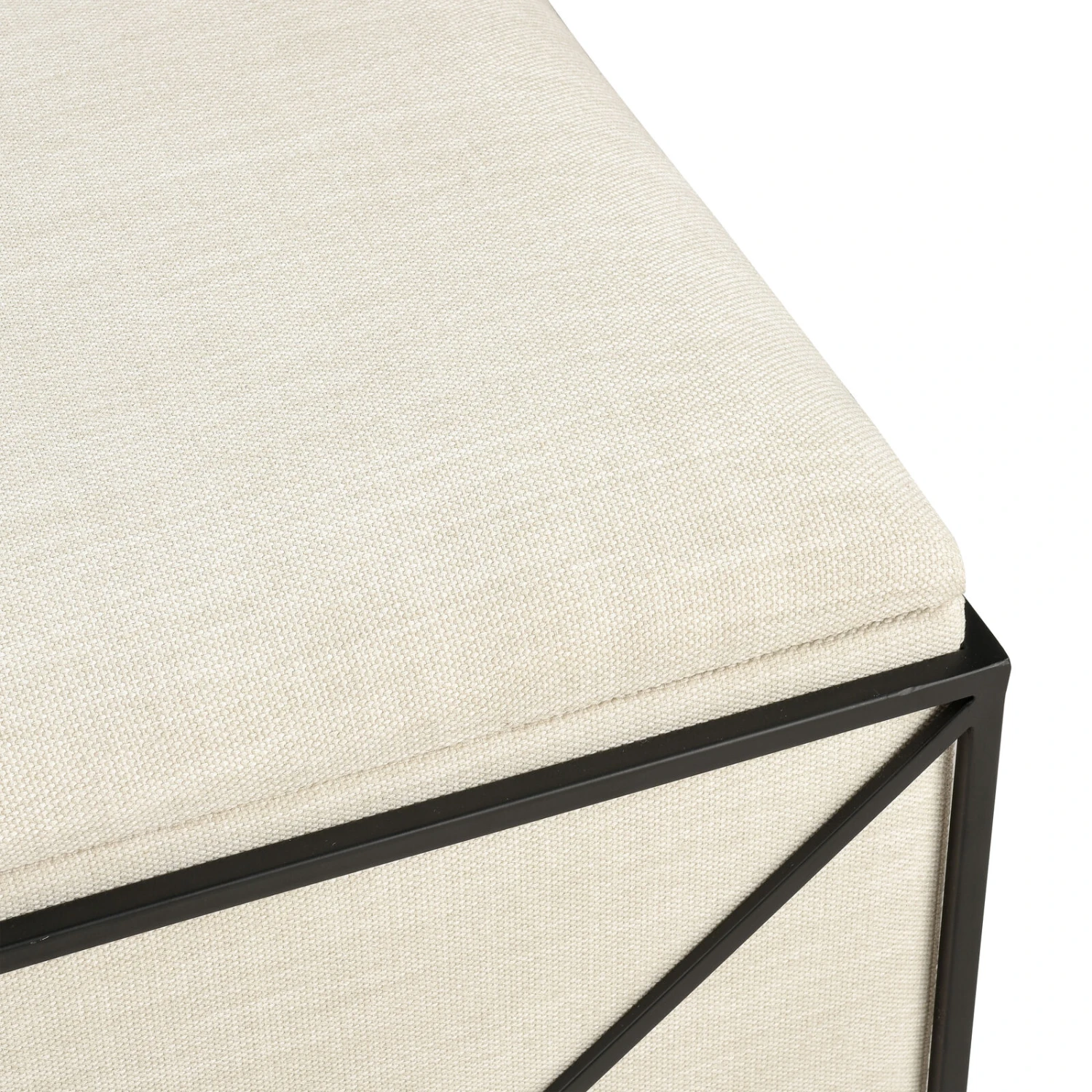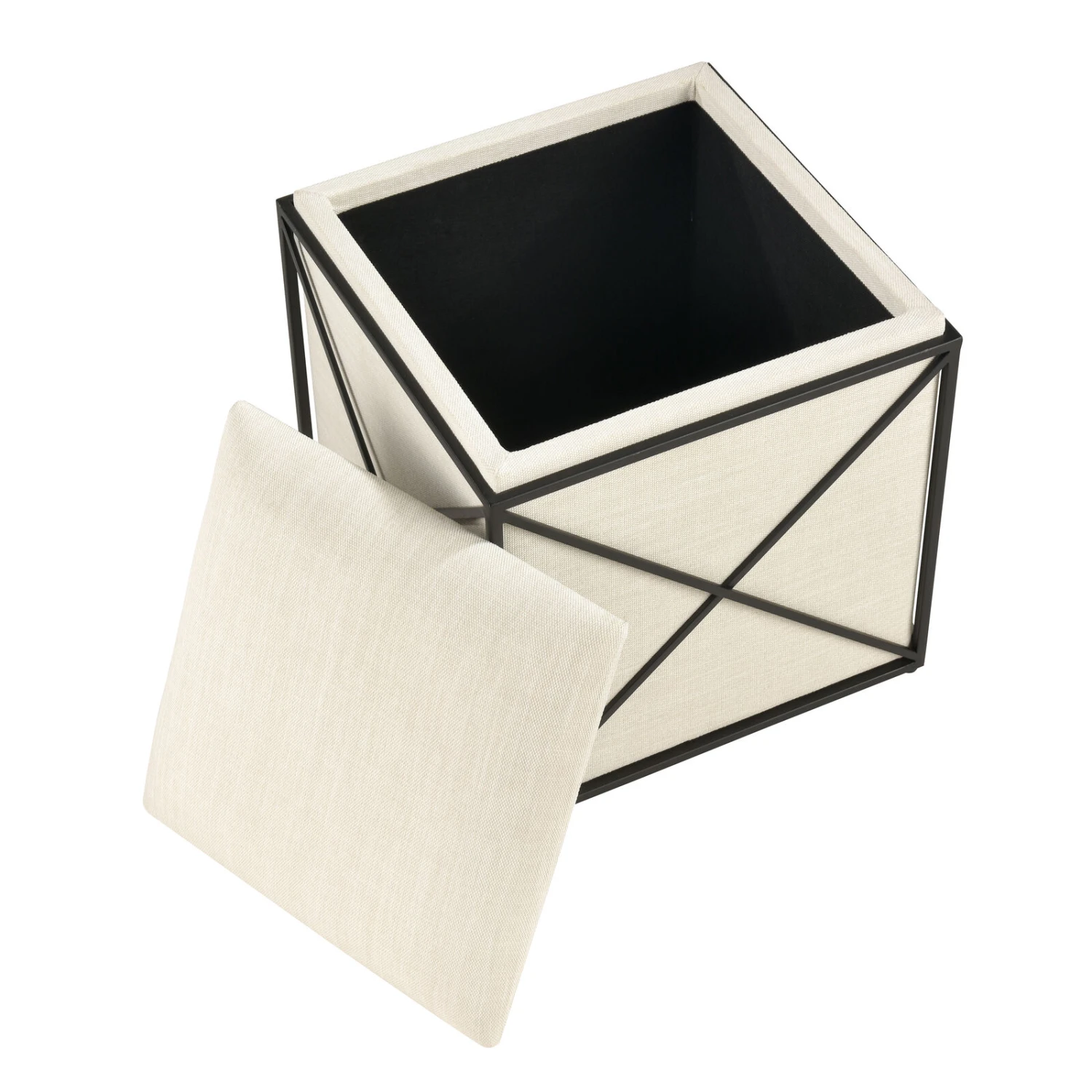 The Axel Storage Ottoman has a rectangular shape and a storage compartment within. Fully upholstered in beige linen, the ottoman also features a black iron frame that criss-crosses on each side.