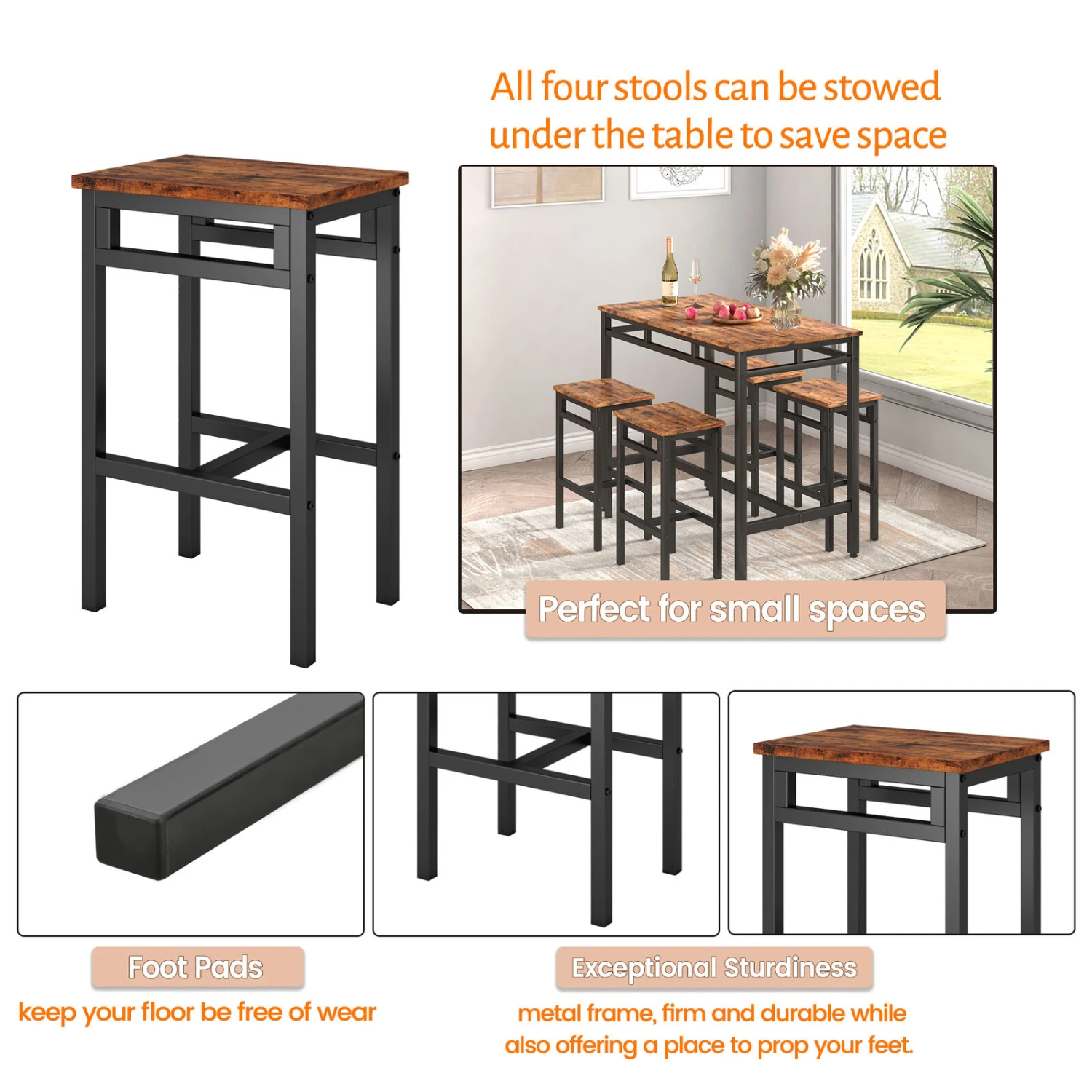 Bar table set 5PC Dinging table set with high stools, structural strengthening, industrial style (Rustic Brown,43.31”w x 23.62”d x 35.43”h)