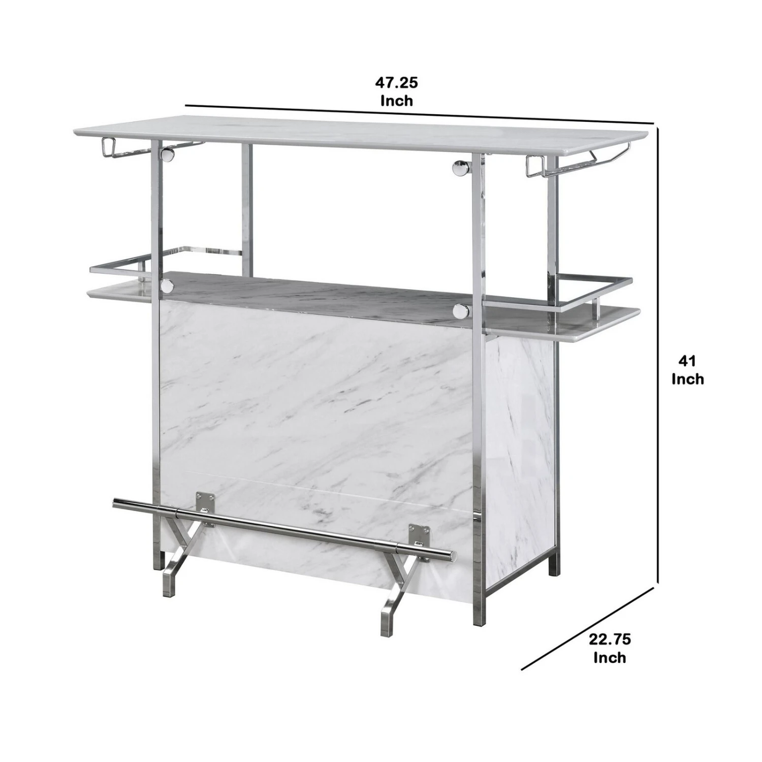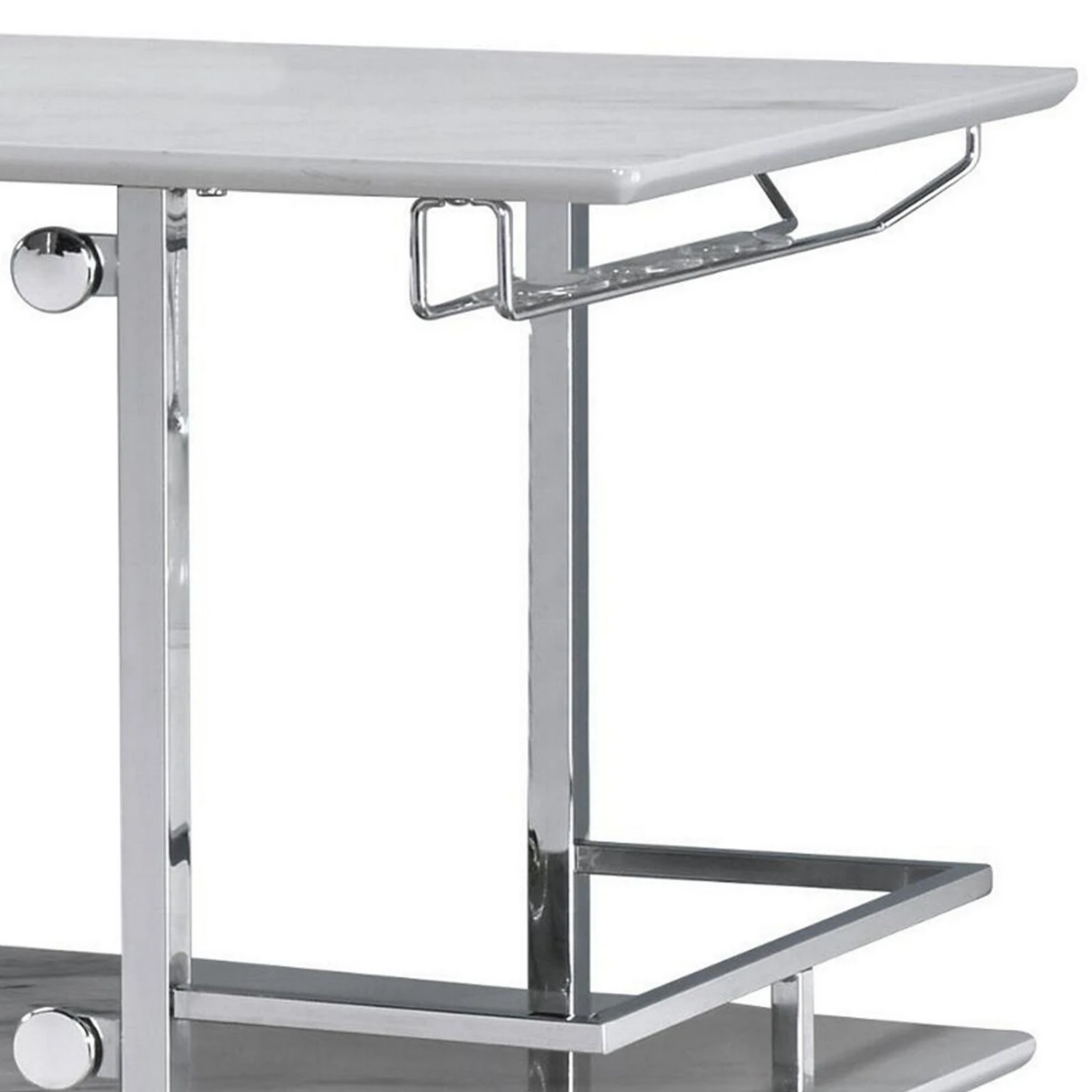 Bar Table with Faux Marble and Chrome Finish, White and Silver- Benzara