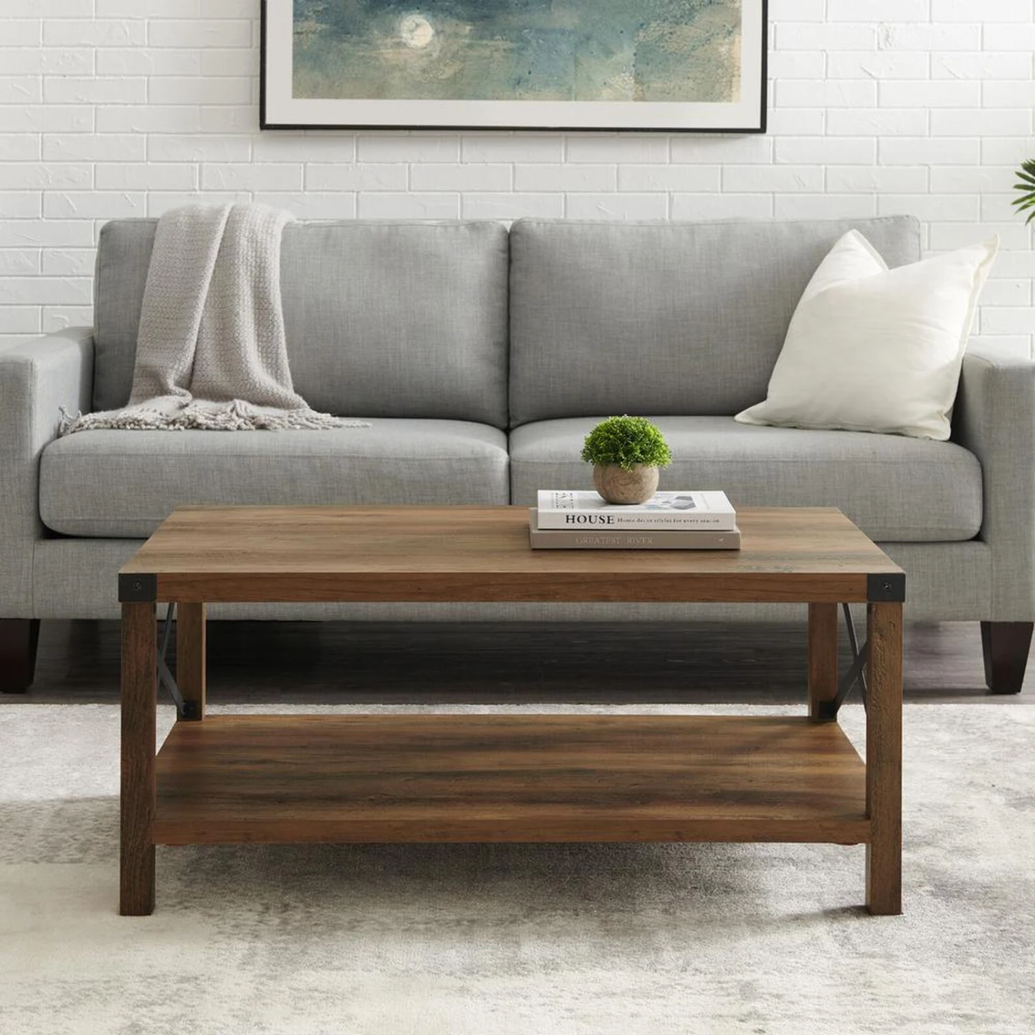 Industrial Rustic Coffee Table – Rustic Oak Collection, Belen Kox. Rustic Industrial Style: The industrial-inspired design of this coffee table adds rustic charm to your living room, creating a unique and visually appealing focal point. Striking Contrast: The black painted metal accents on the top corners and x-shaped sides create a visually striking contrast against the wood textured surface, enhancing its aesthetic appeal