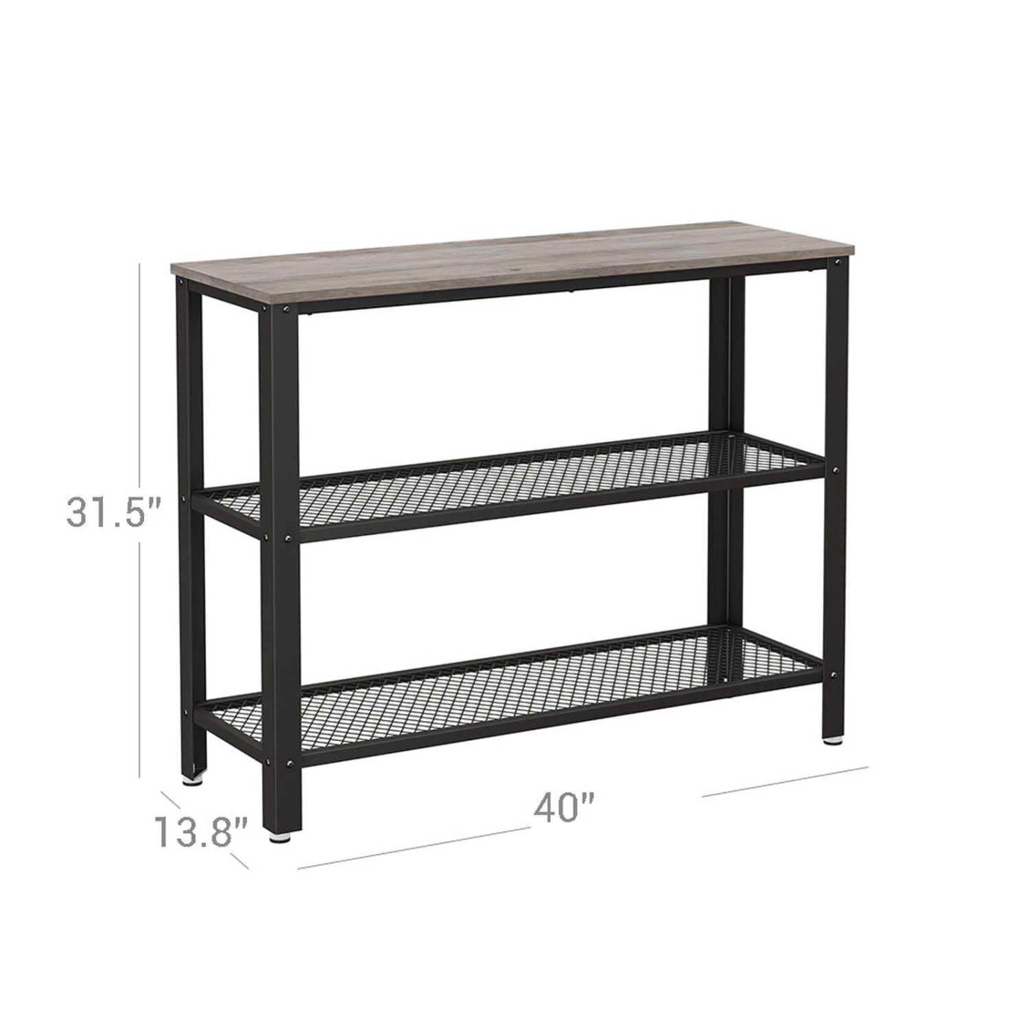 - QUICK-CHANGE ARTIST Use the 40” long console table with 2 mesh shelves in various rooms. Place it in the hallway as a key rack and shoe shelf. In the living room, bedroom, or beneath the staircase, the chic side table is a welcome jewel