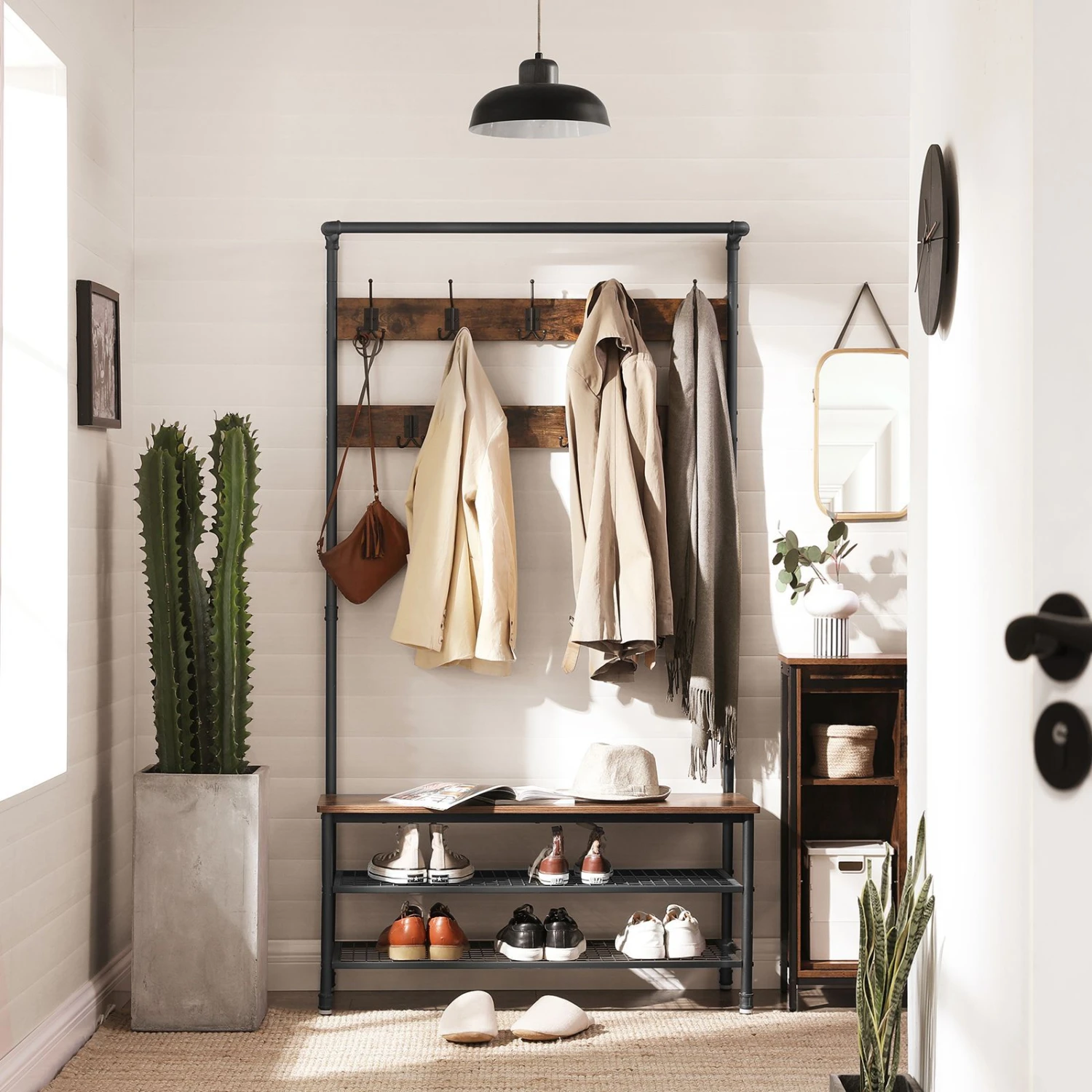 - WELCOMES YOU HOME: Eliminate clutter in your hallway with this smart coat and shoe rack; featuring the perfect balance of clean lines, modern elegance and effortlessly rustic appeal