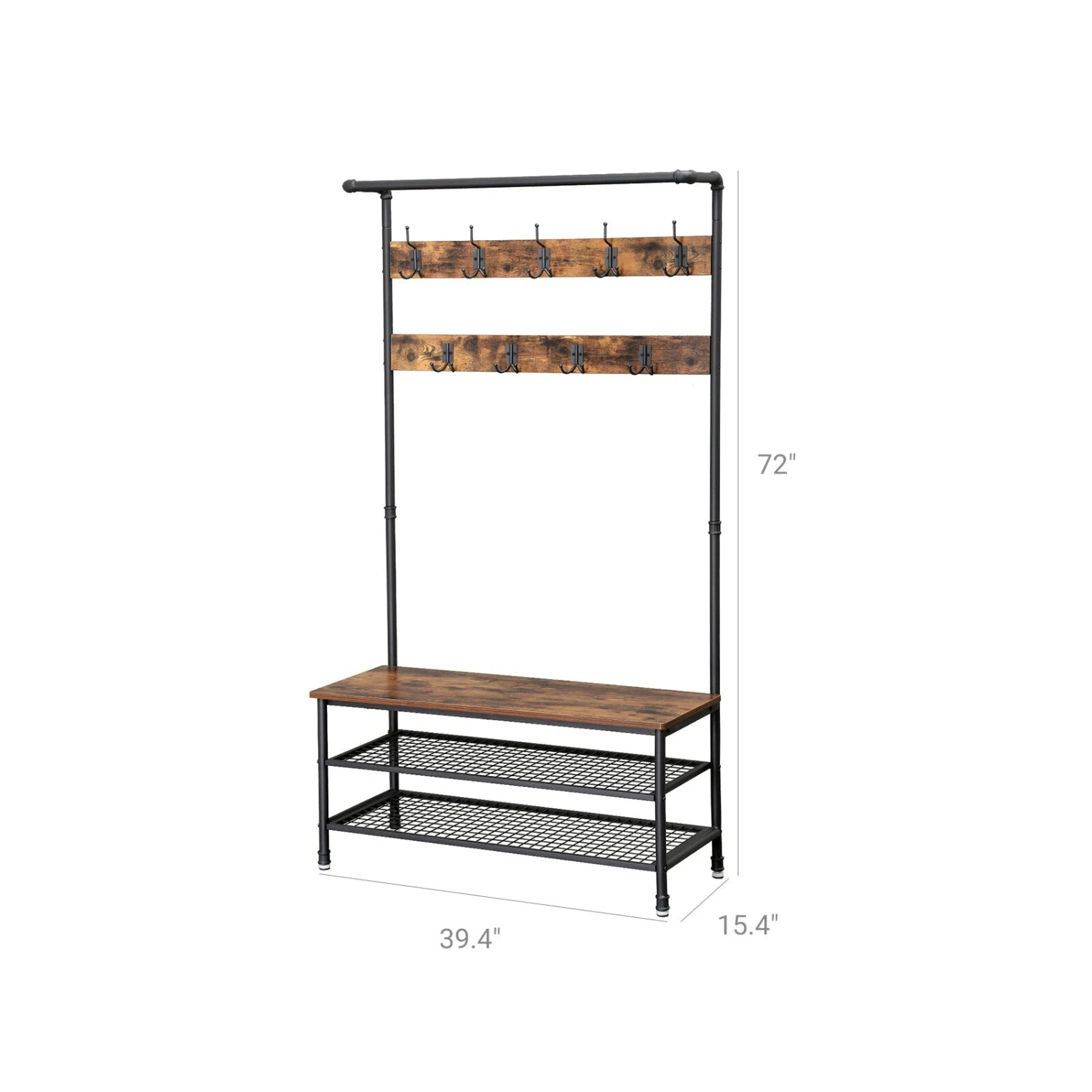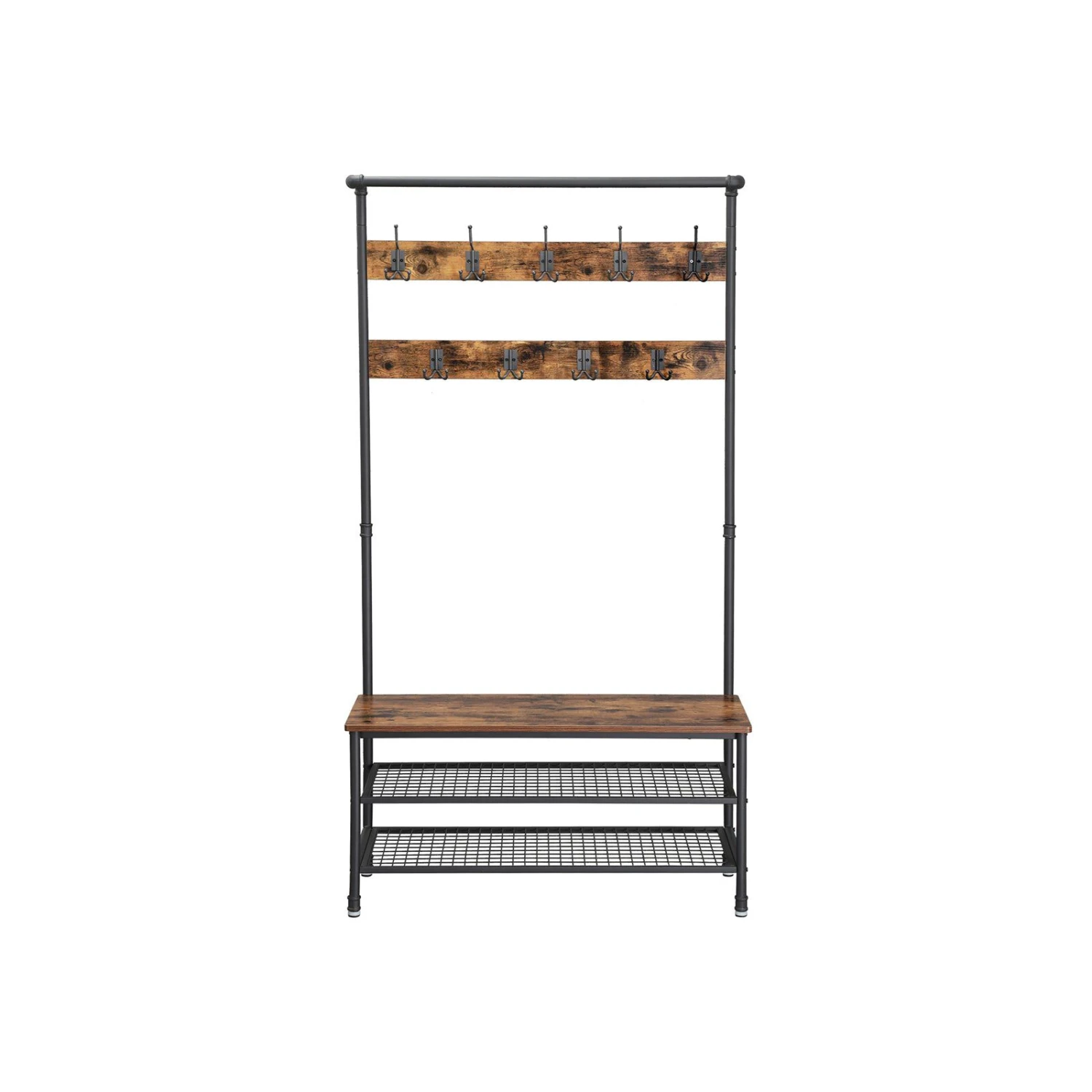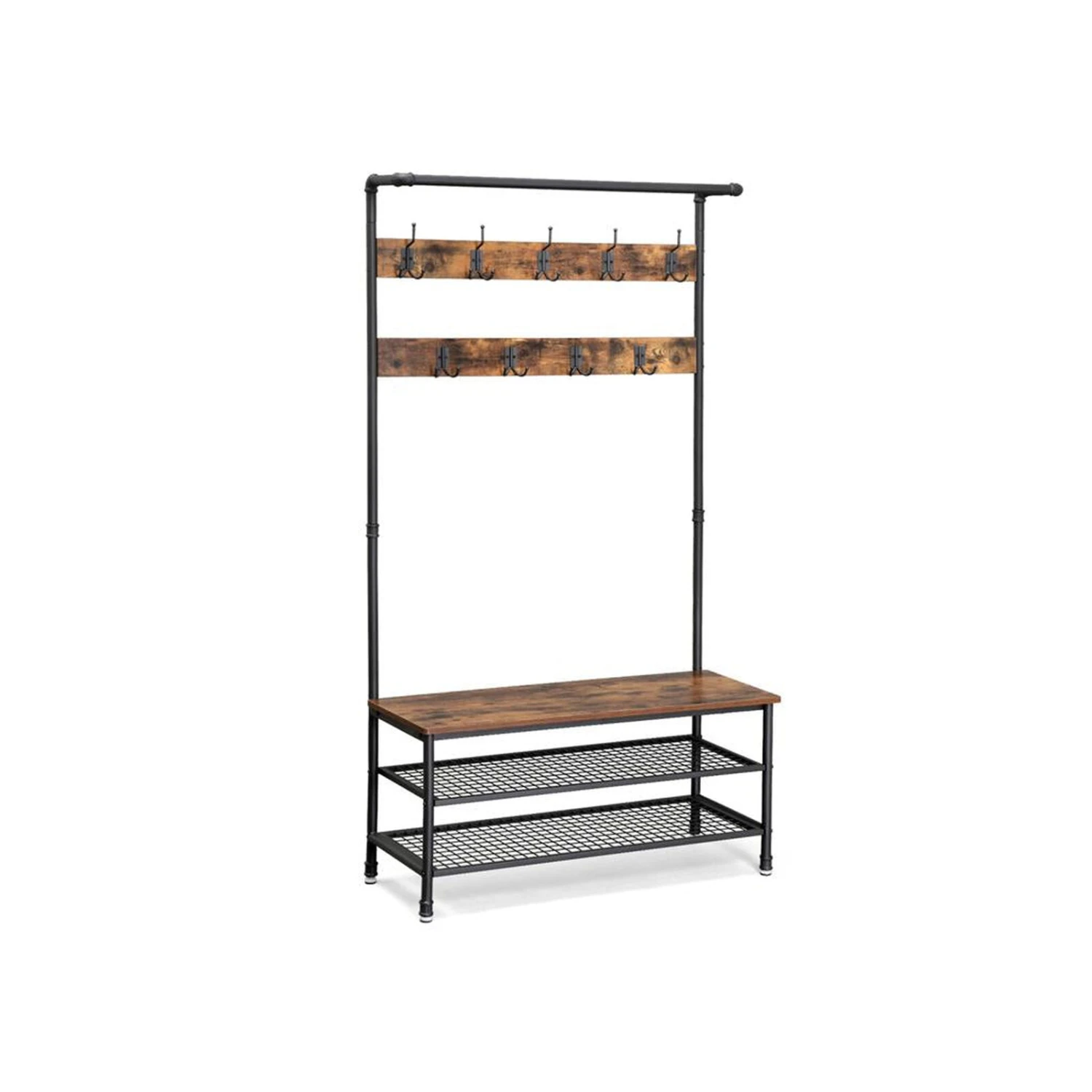 - EVERYTHING YOU NEED: After coming back home at the end of the day, just hang your coat, hat and scarves on any of the top 5 dual hooks, sit on the bench to remove your shoes and put them on the either of 2 metal mesh storage shelves