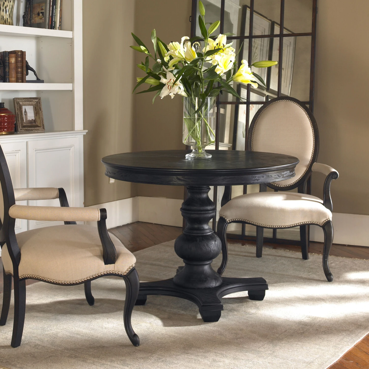 An elegant entryway table or small dining table, featuring detailed moldings and a stylish turned baluster in a satin black finish with subtle pine wood grain.