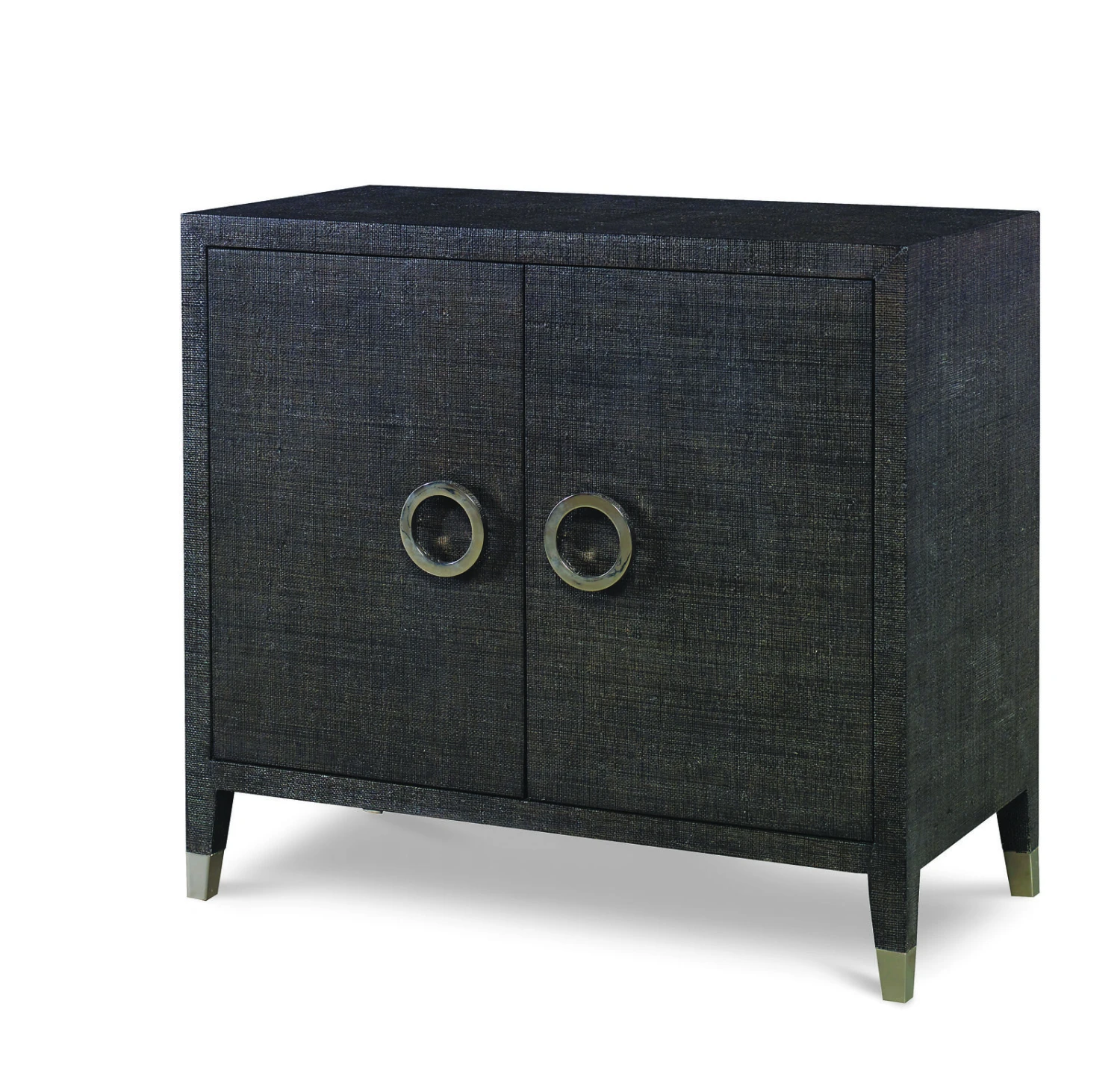 The Charleston door chest is a decidedly modern chest crafted of Saguran raffia, hand woven on the island of Bohol in the central Visayas region of the Philippines. Hand woven from the fibers of the Tipot palm tree this raffia features a rich dimensional depth not found in lesser machine woven grasscloth. Tapered legs with chrome plated ferrules. Behind the two doors is one adjustable shelf. Tempered glass top included.