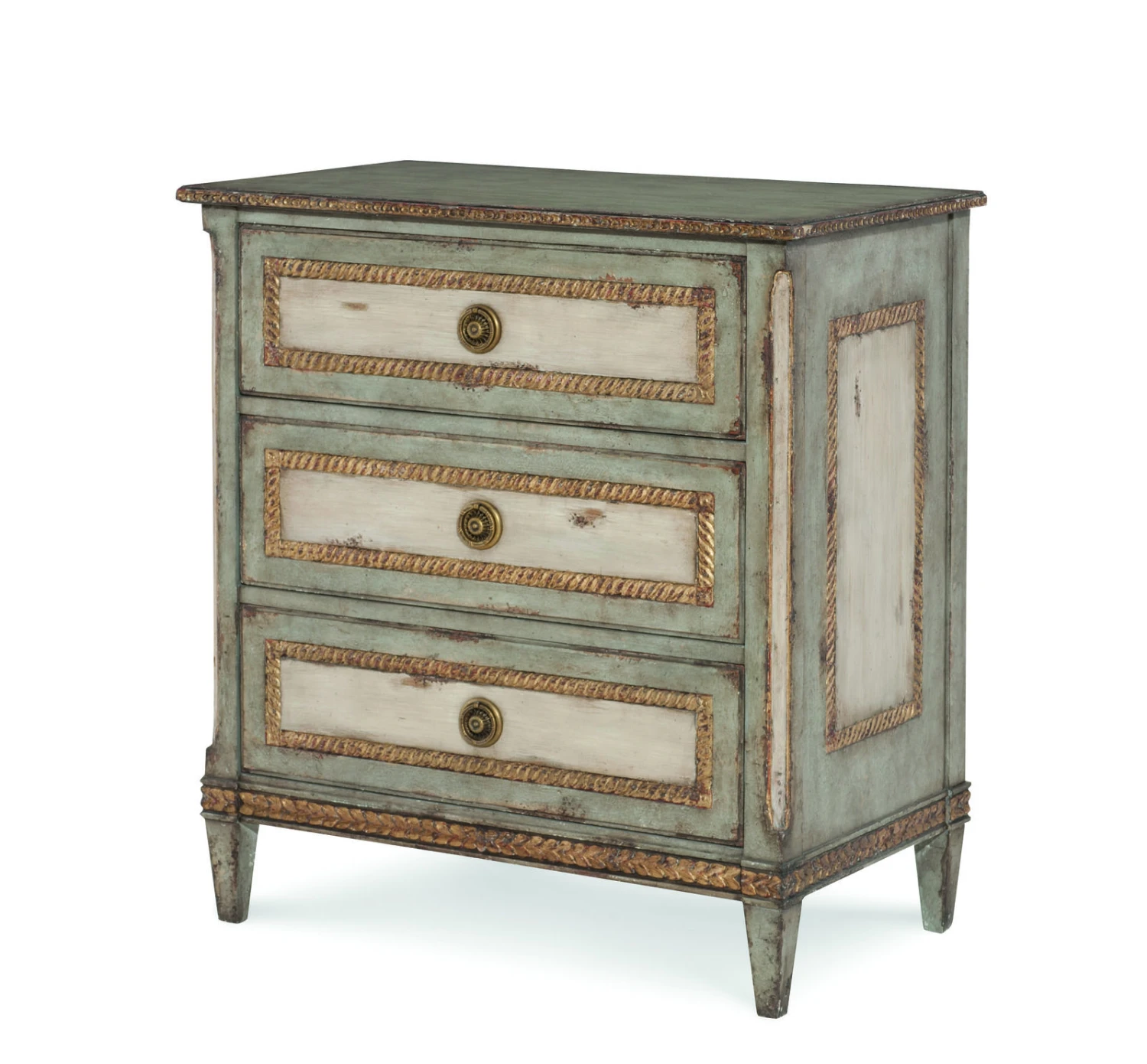 The Corbett Nightstand is a traditional Italian inspired design featuring a hand carved repetitive leaf motif, raised moldings and fluted legs. The finish is an aged sage green and antique cream paint with gold leaf accents on the carving. With three drawers Corbett has ample storage.