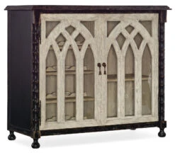 Take your hospitality to a new level with the Ciao Bella Bar, inspired by arched church windows from the Italian countryside. The two-tone finish pairs a black outer case with a Flaky White finish on the doors and a natural-colored finish on the interior. Practical as it is pretty, the bar features two glass doors with wood overlay with one adjustable shelf behind the right door and 4 fixed shelves behind the left door. Each shelf has rivets for wine bottles, and the bar accommodates up to 16 wine bottles. There are 3 wine glass racks behind the right door, and each rack can accommodate up to 3 wine glasses.