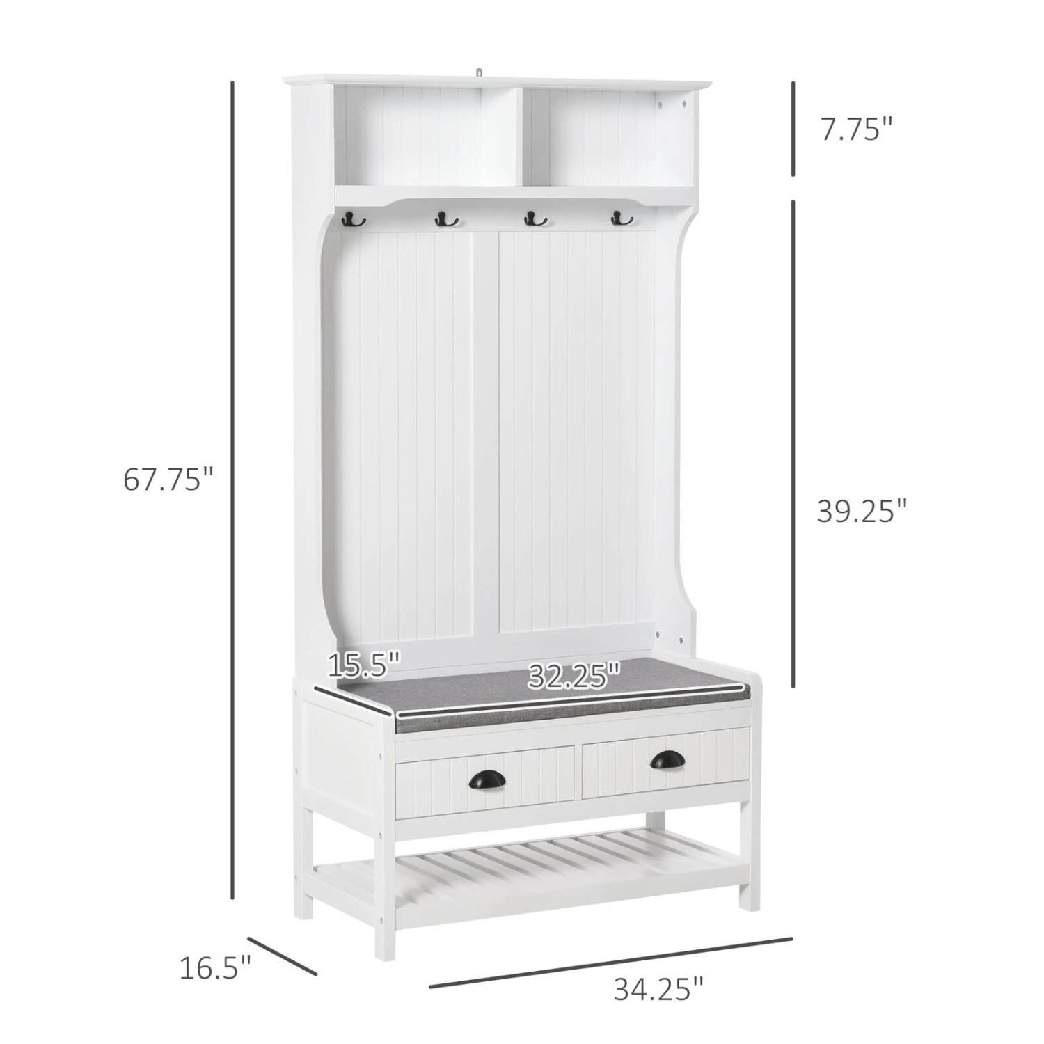 Coat Rack Stand Shoe Storage Bench Hall Tree Organizer with Hooks Shelves Drawers Padded Seat Cushion for Entryway Hallway, Foyer White