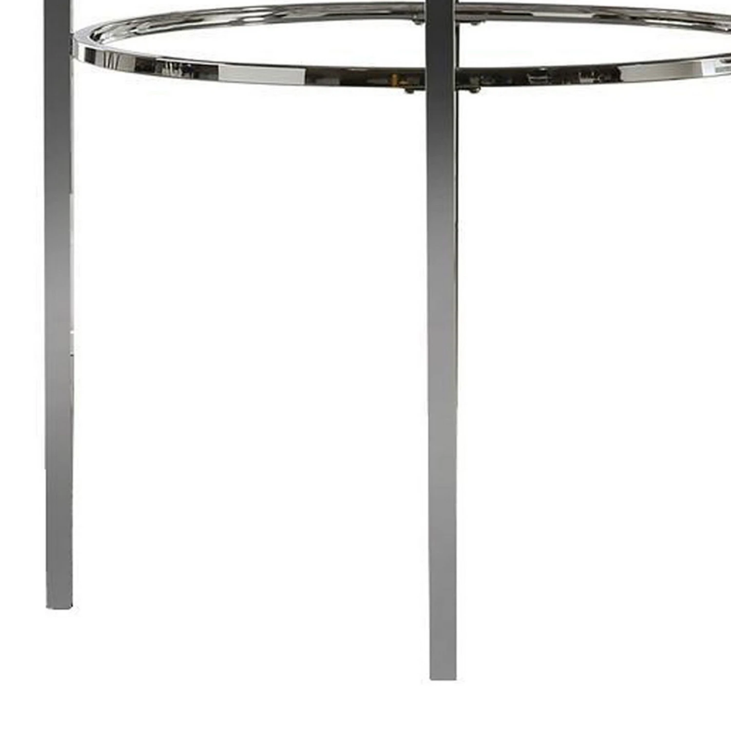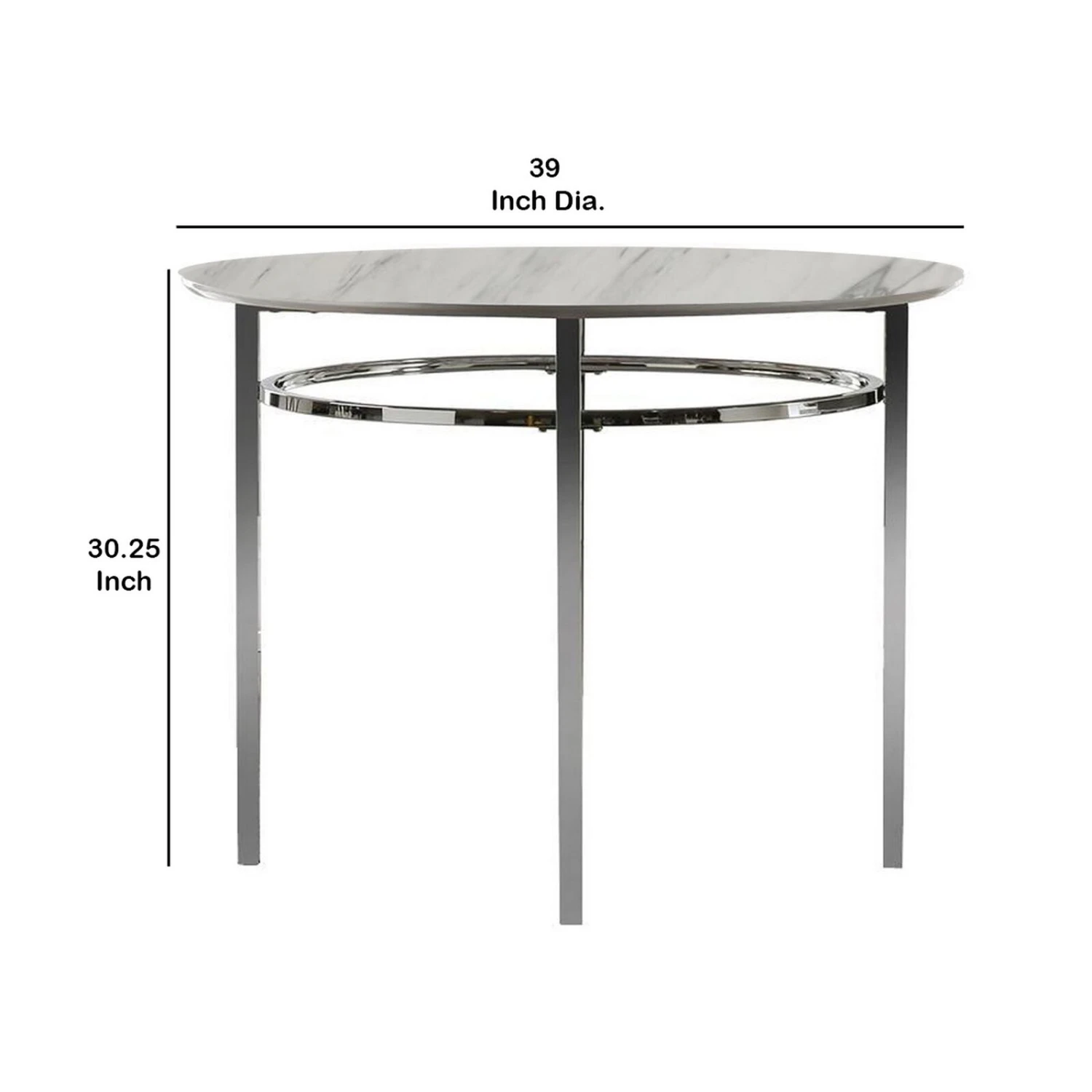 Contemporary Round Dining Table with Faux Marble Top, White and Chrome-Benzara