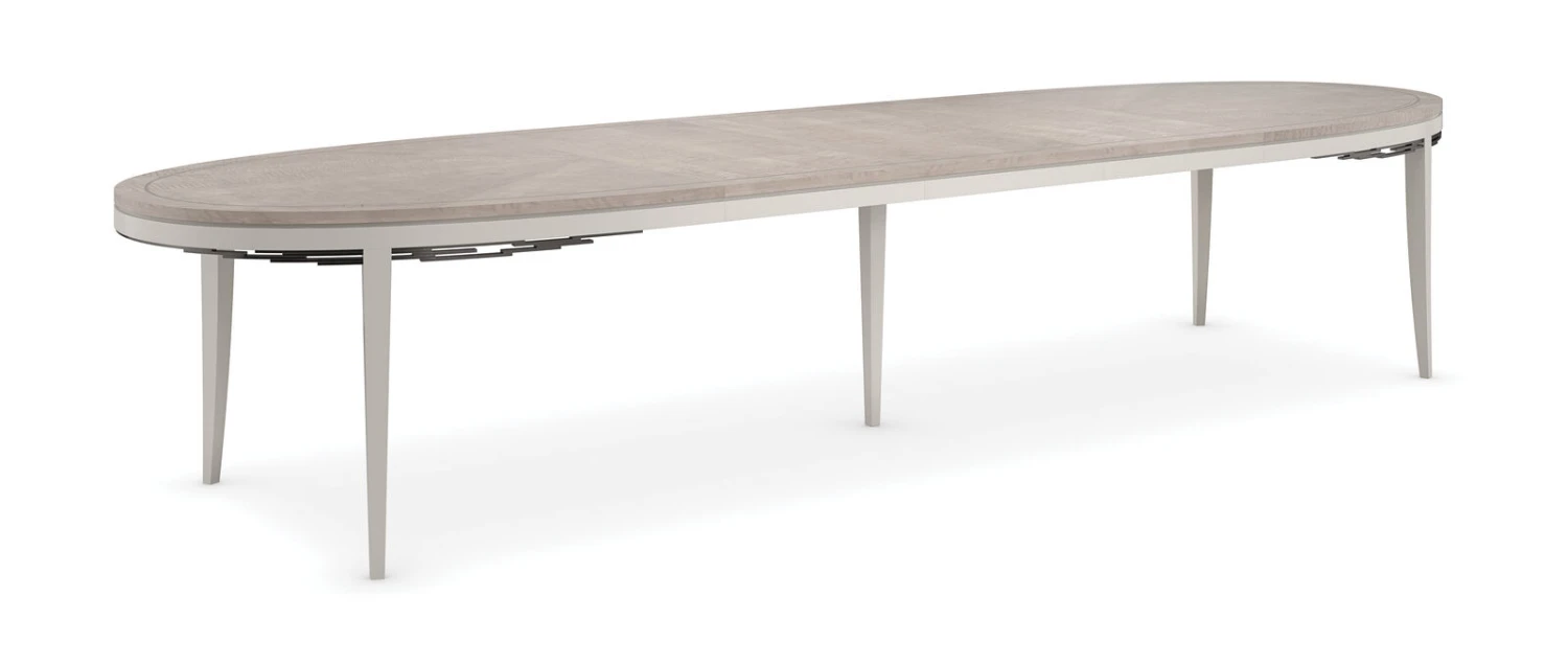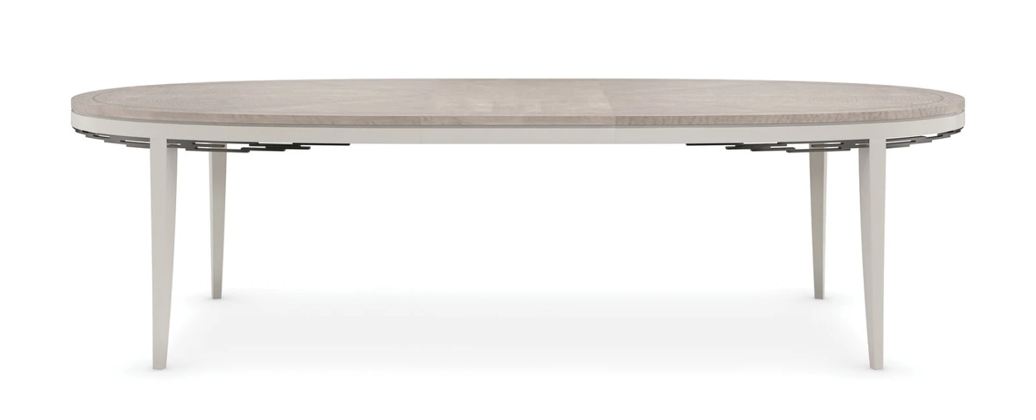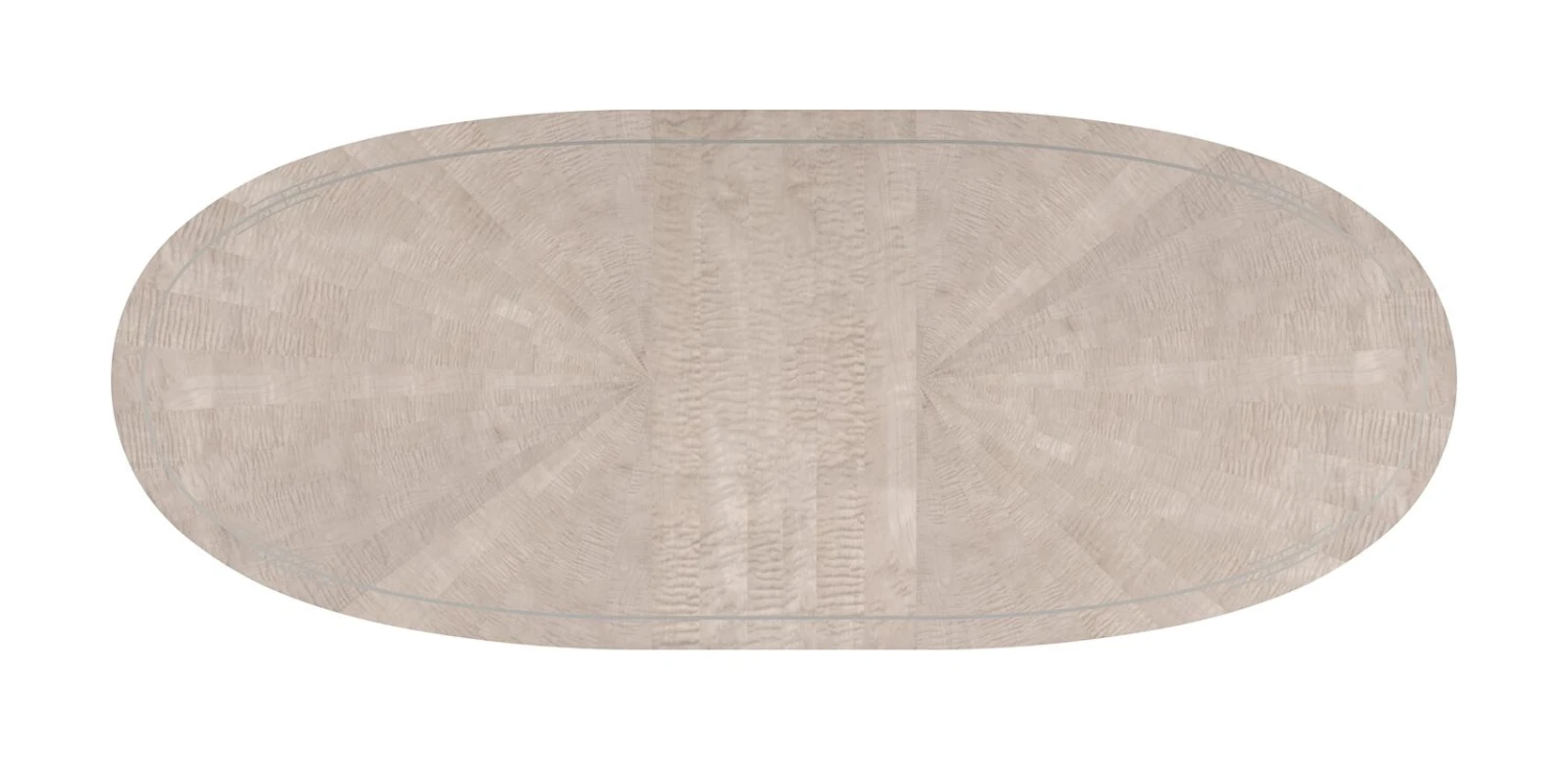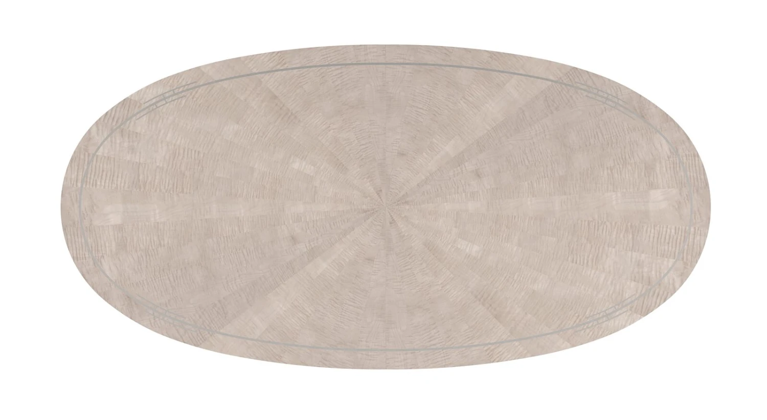 This spacious, oval-shaped dining table makes an elegant statement with a radiating pie veneer pattern on top, intricately crafted from Grey Curly Maple. A neutral Chinchilla finish gives light to flaring wood grains, delicately framed by a silkscreen pinstripe detail in Soft Silver Paint that repeats the decorative metal fretwork beneath the apron. Includes three 22′ leaves that allow you to easily extend the table and seat up to 12 guests.