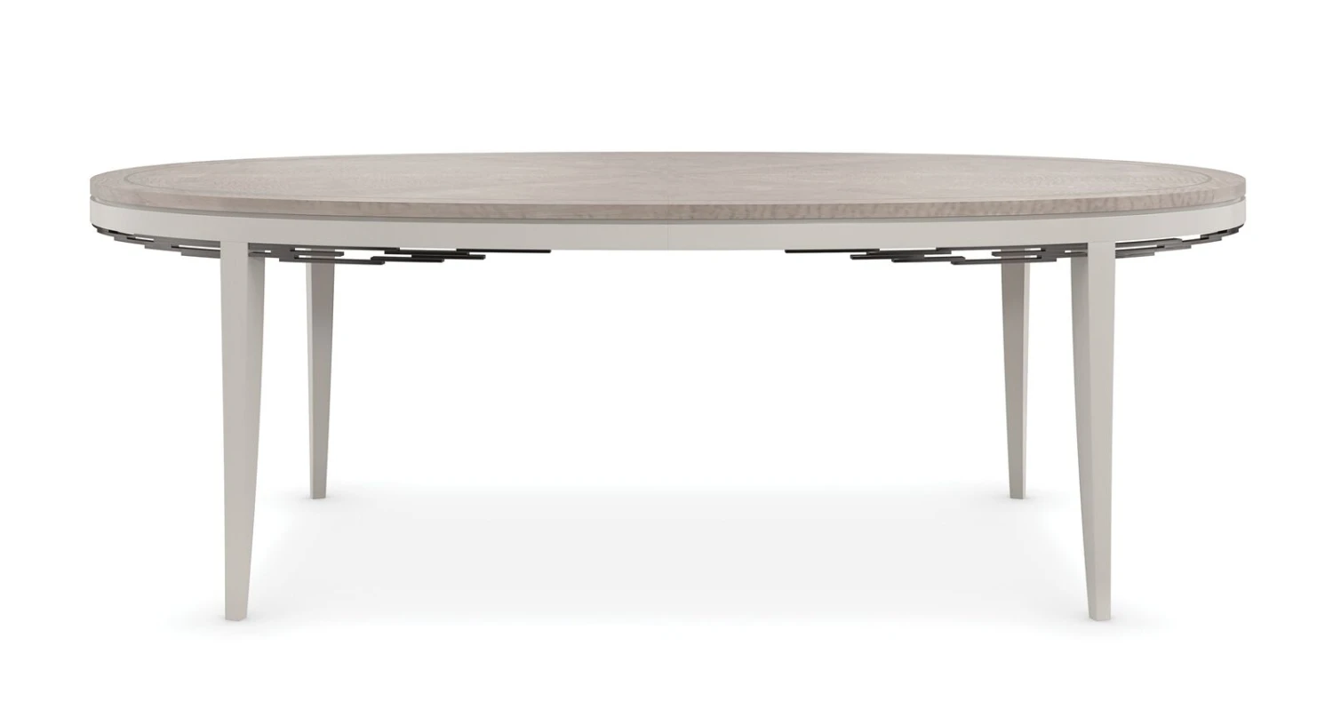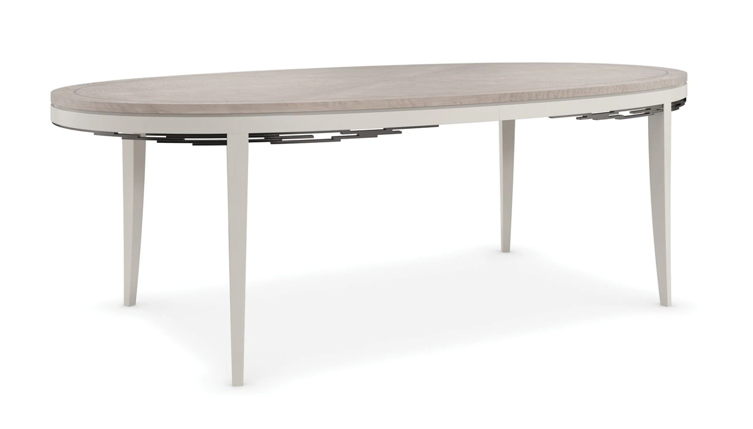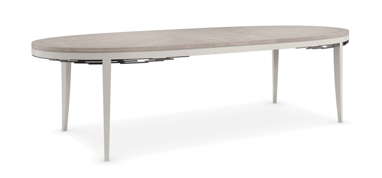 This spacious, oval-shaped dining table makes an elegant statement with a radiating pie veneer pattern on top, intricately crafted from Grey Curly Maple. A neutral Chinchilla finish gives light to flaring wood grains, delicately framed by a silkscreen pinstripe detail in Soft Silver Paint that repeats the decorative metal fretwork beneath the apron. Includes three 22′ leaves that allow you to easily extend the table and seat up to 12 guests.