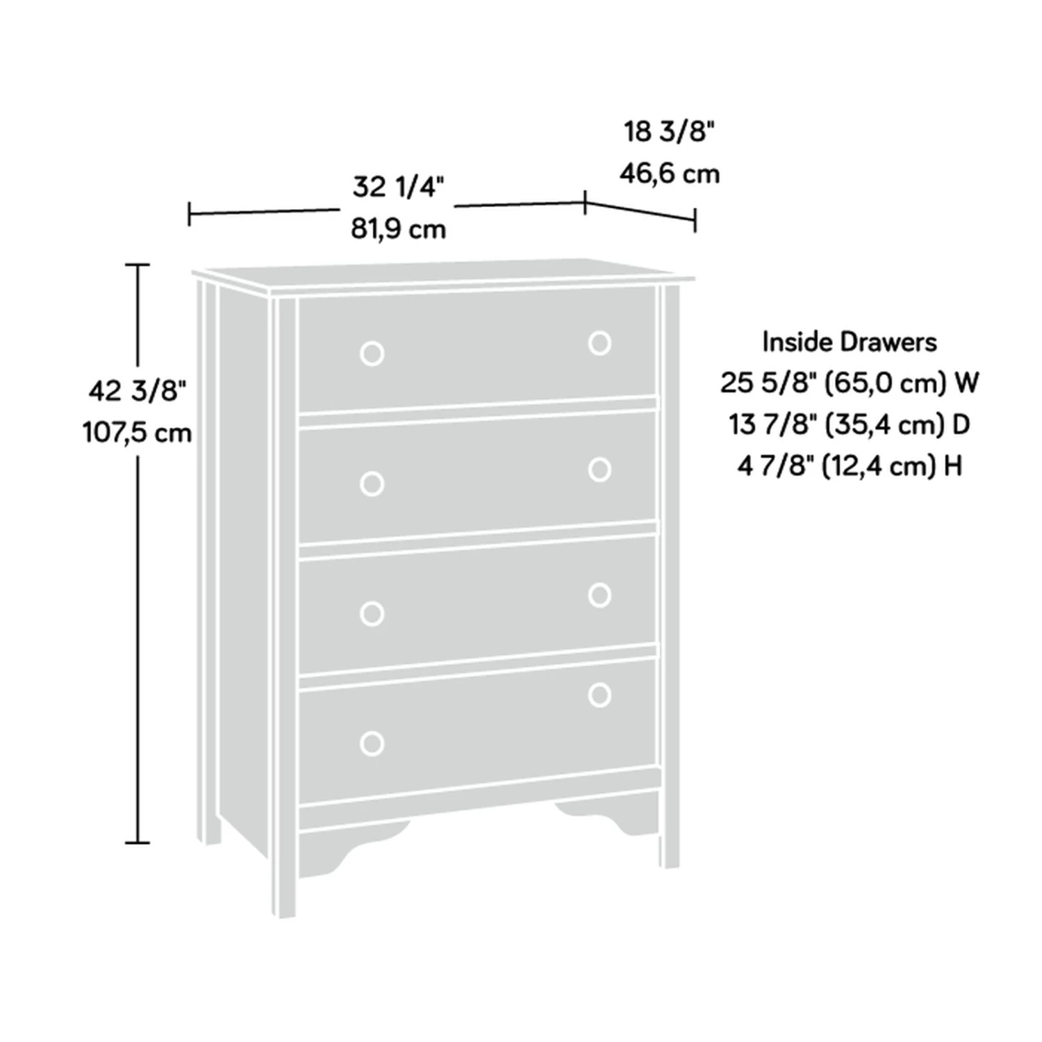 Country chic never looked so good. Invite a traditional feel with an eclectic look with this 4-drawer chest from the Dawson Trail® collection. This chest of drawers features four drawers with metal runners and safety stops, with the ability to hold the bulkiest sweaters, thickest denim, extra linens, and much more. The top surface of this wood chest of drawers is the optimal place for your alarm clock, phone charger, perfume bottles, and other daily necessities. This 4-drawer dresser includes a tip restraint safety strap for an added layer of security to prevent tip over accidents. Quick and easy construction is possible with a T-slot drawer system that saves time during the assembly process. Finished in a deep Raven Oak®, this bedroom furniture brings traditional design elements with a breathtaking finish into your master bedroom, guest room, and wherever you need more storage space. *Customer Assembly *