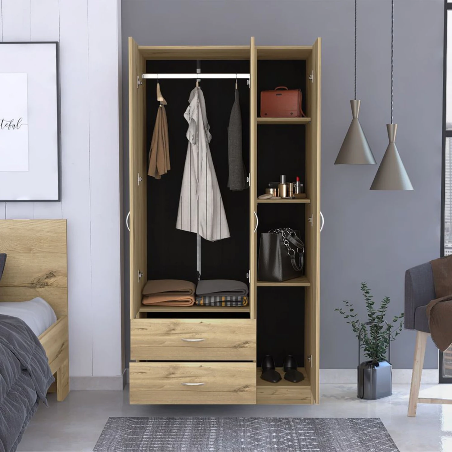 Bosko 3 Doors Armoire, Two Drawers, Metal Rod