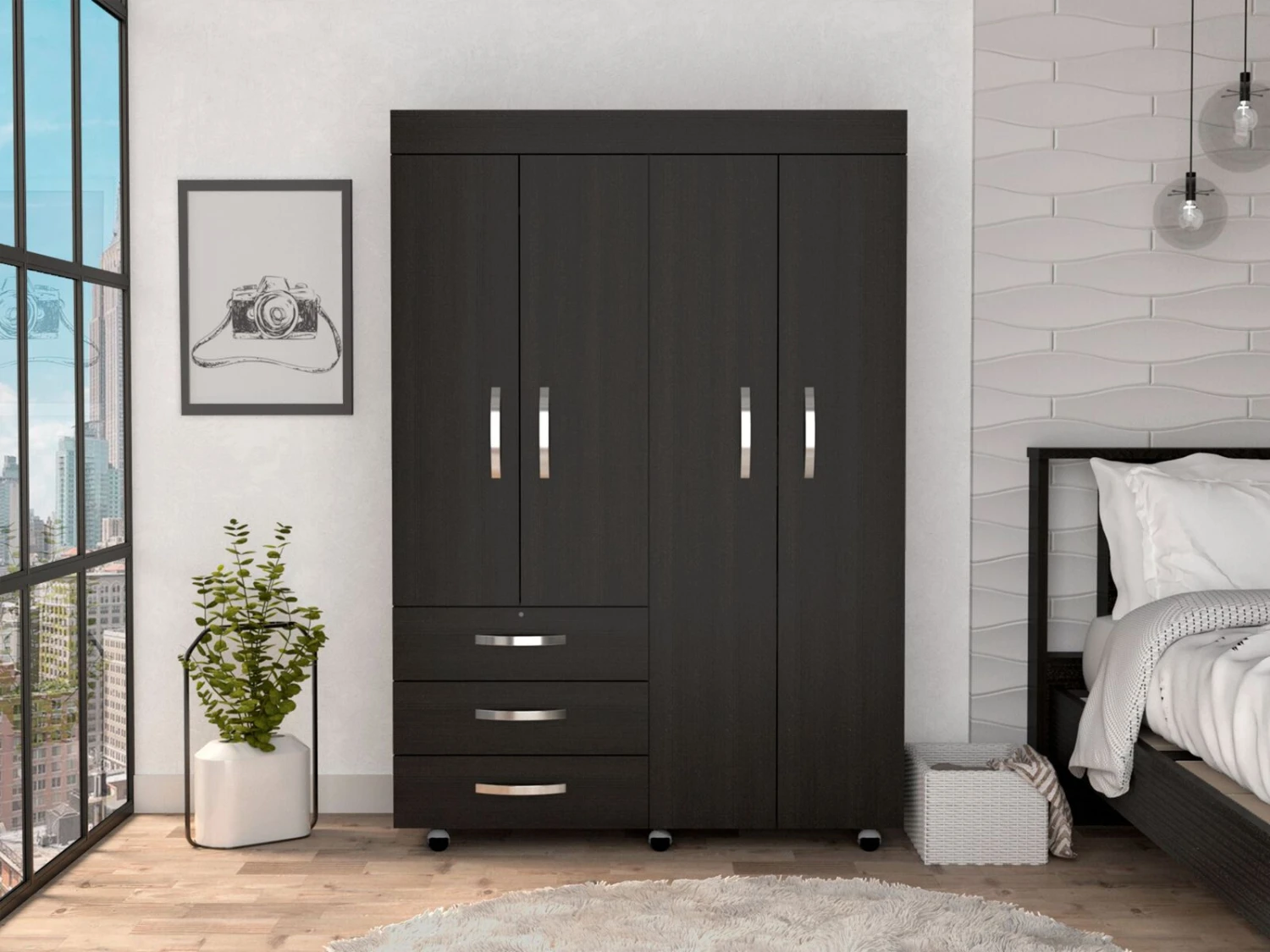 On the left side, a Double Door Cabinet Cabinet with an interior hanging rod will give you great space to hang your clothing.