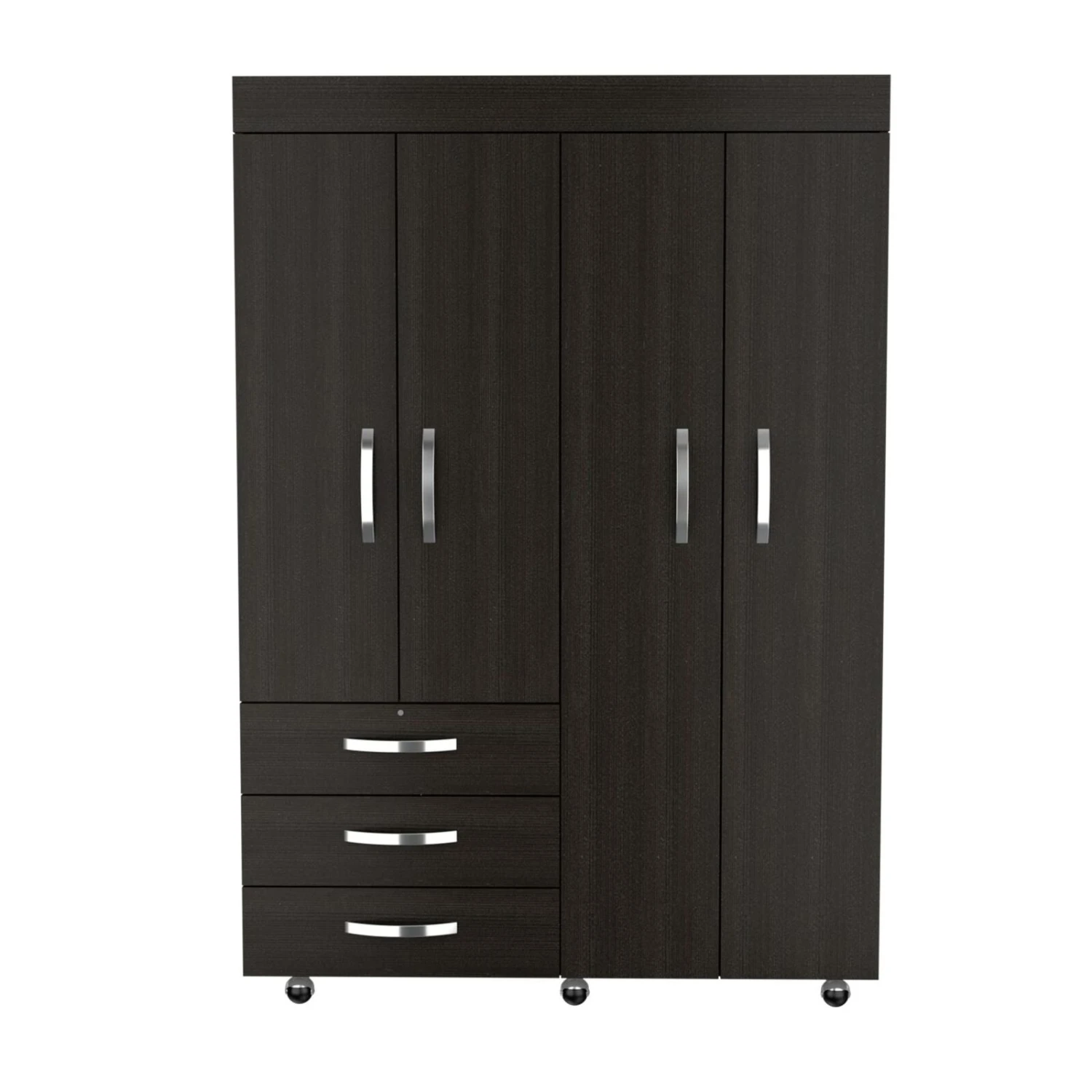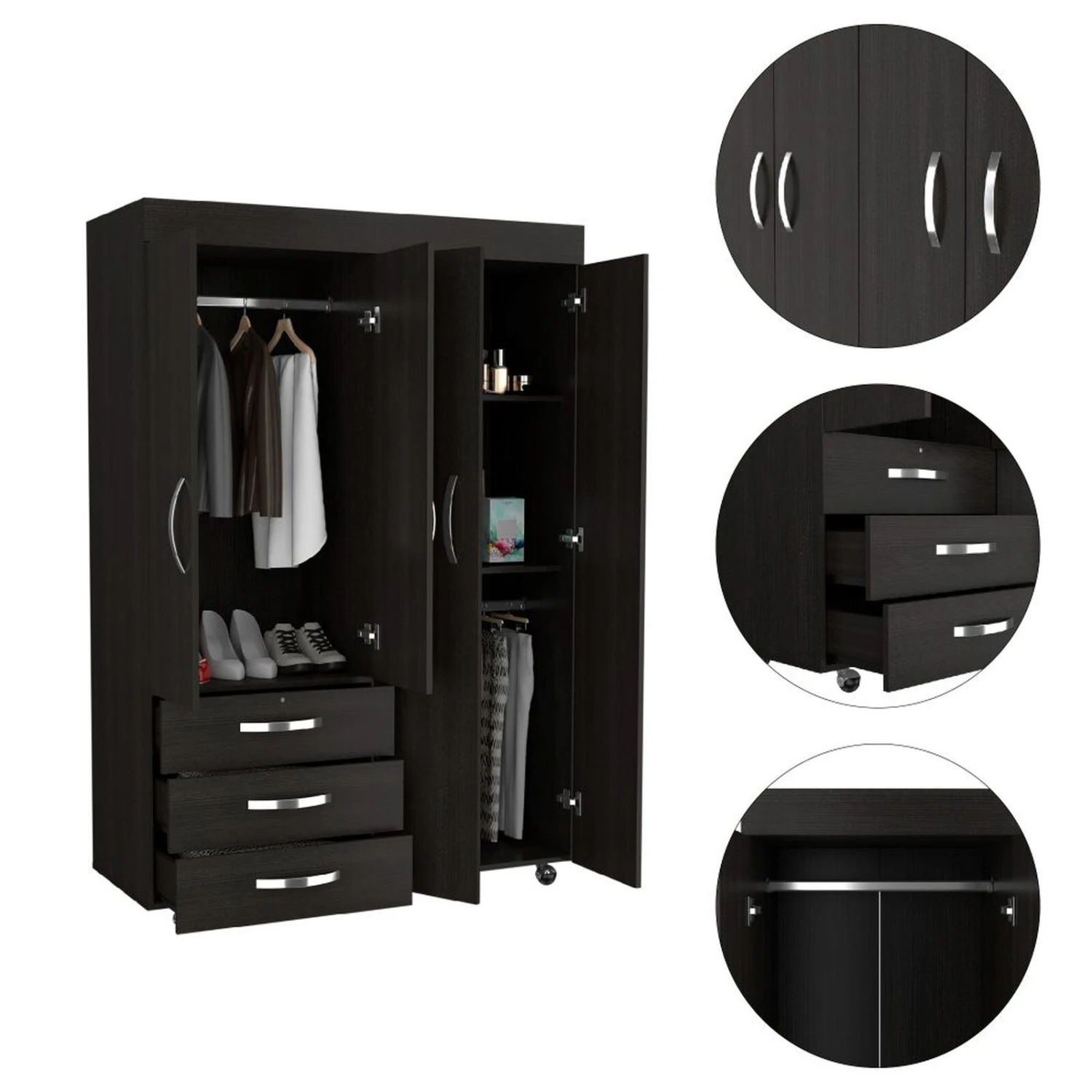 DEPOT E-SHOP Hamilton Mobile Armoire, Double Door Cabinet, Three Drawers, Rods, Two Shelves, Black