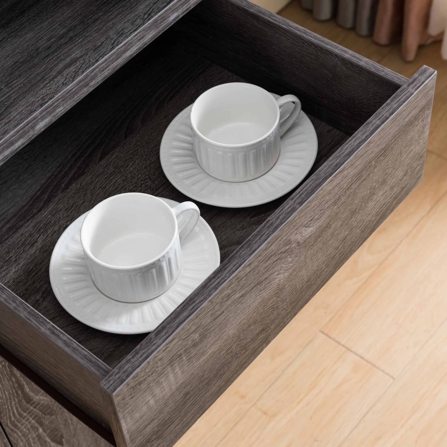 Our modern style wine cabinet has an open display which is great to display your home acessories. Two glass shelves give the cabinet an open look for showcasing your wine bottles, glass ware, or home photos. Bottom storage cabinet is convinent for storing items you may want to keep out of sight.