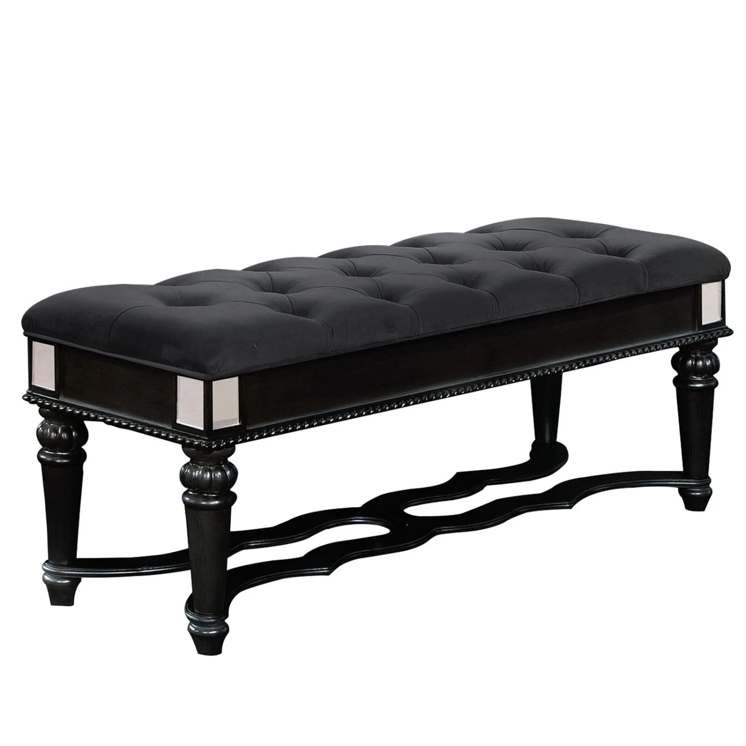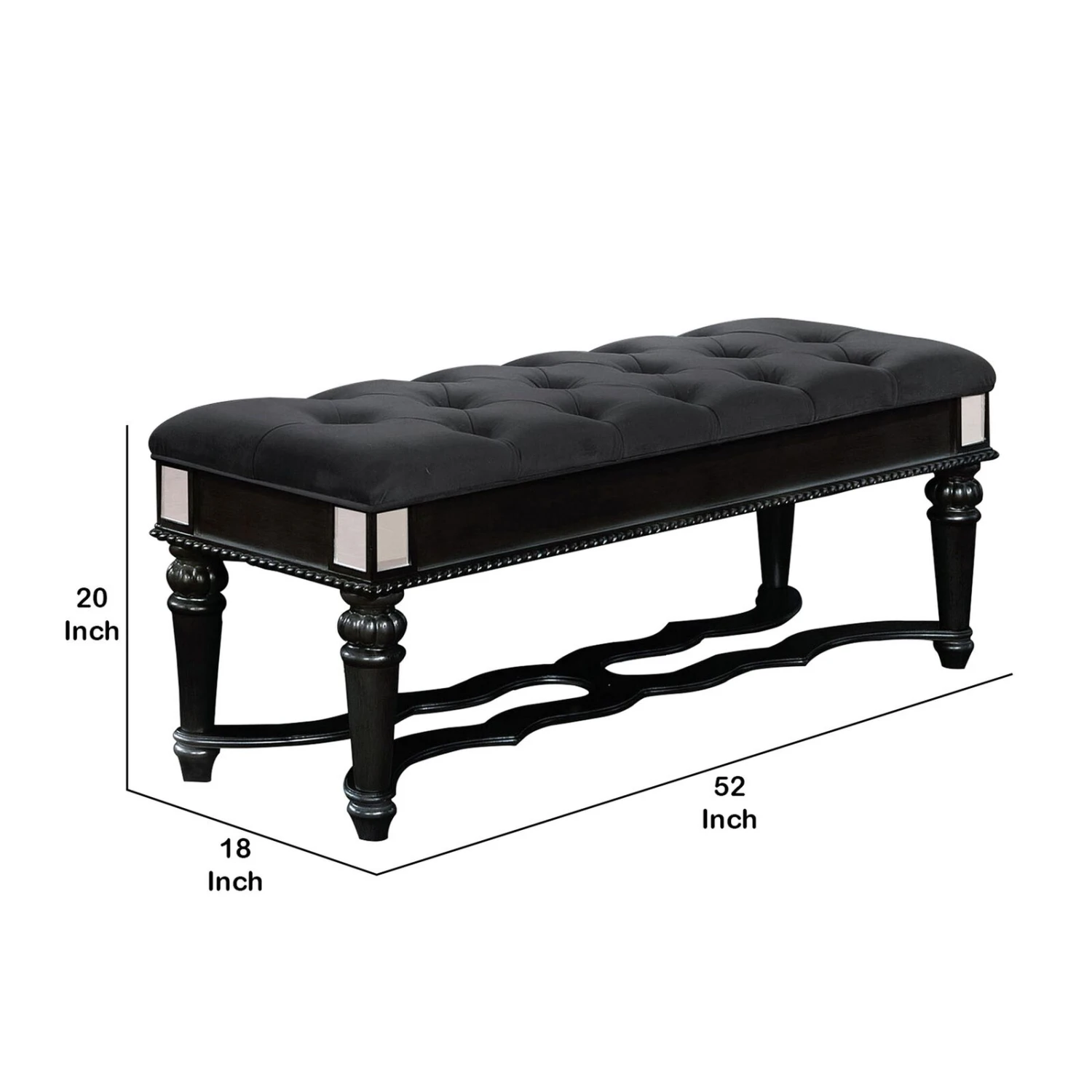 Fabric Padded Bench with Deep Button Tufting and Turned Legs, Black- Benzara