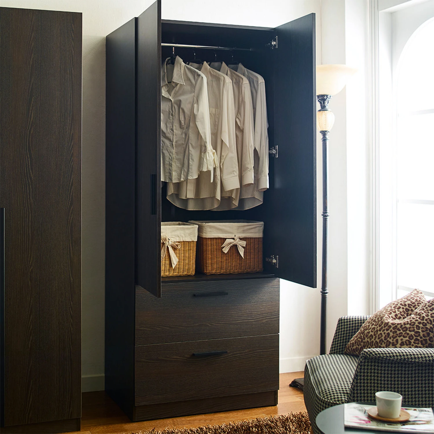 Feel confident with an organized dressing area by choosing this two-door wood closet with two drawers and hanging bars. Two large cabinet doors keep items concealed, while two lower drawers organize socks and other small essentials. A wood grain exterior and black bar pulls make this piece ideal for contemporary spaces.