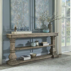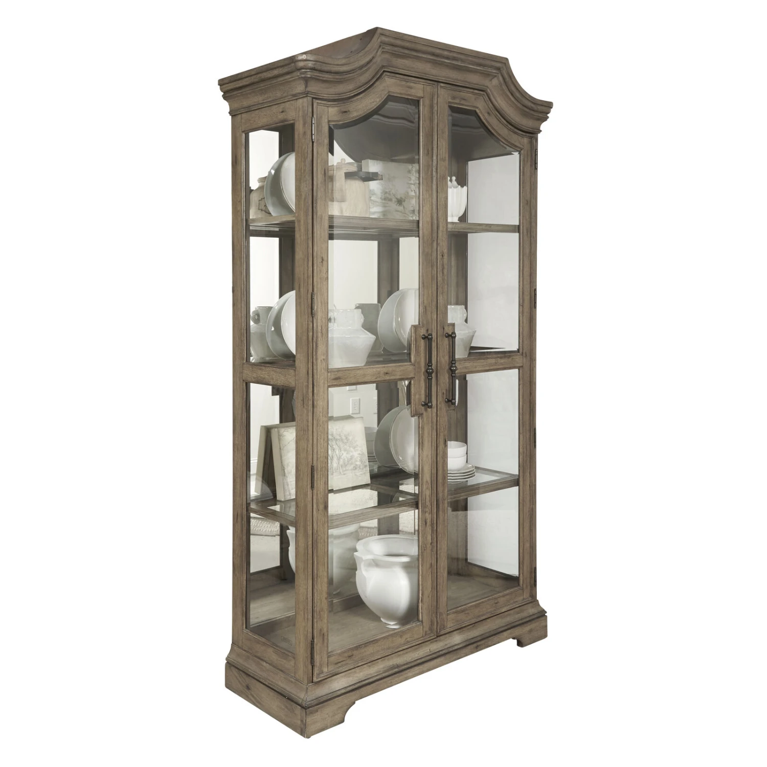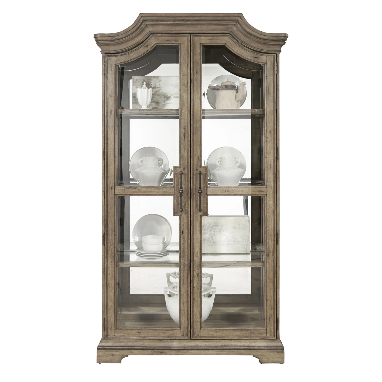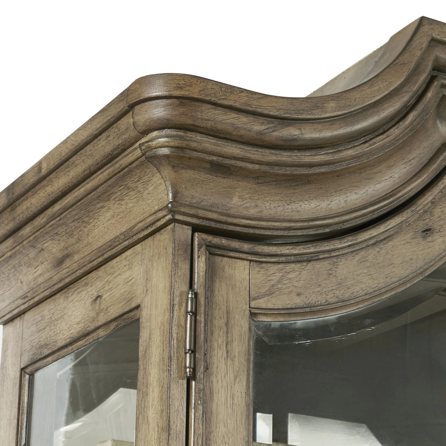 Being focal-point worthy, our stunning Garrison Cove Display Cabinet protects while beautifully and elegantly showcasing your precious collectibles. Finished in the rustic taupe Ancient Scroll finish with gray undertones over Oak Veneers, this cabinet has three wood-framed glass shelves, two shelves are adjustable/removable, and the middle shelf is stationary. Shaped crown molding on the top, designer bar pulls, and bracket feet complete the overall look of the cabinet.
