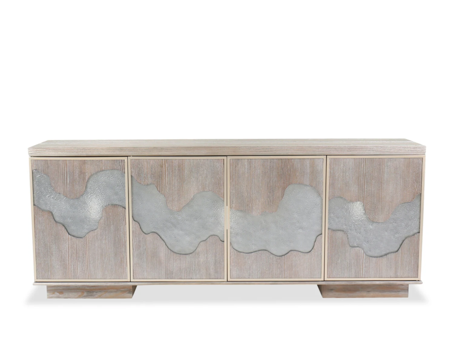 Connecting land and sea, this one-of-a-kind case piece lends substantial style to a space with its unexpected mix of materials and motifs. Crafted of wood veneers finished in Driftwood, it features four doors with individual, custom-cast glass panels that are lightly shaded from behind to create a frosted effect and framed in a Neutral Metallic finish. Behind each door, you?ll find a lighted interior illuminating a Neutral Metallic finish plus adjustable glass shelves and a ventilated back panel. Creating the look of a poured-glass stream, this extraordinary case piece is destined to be the star of the room.