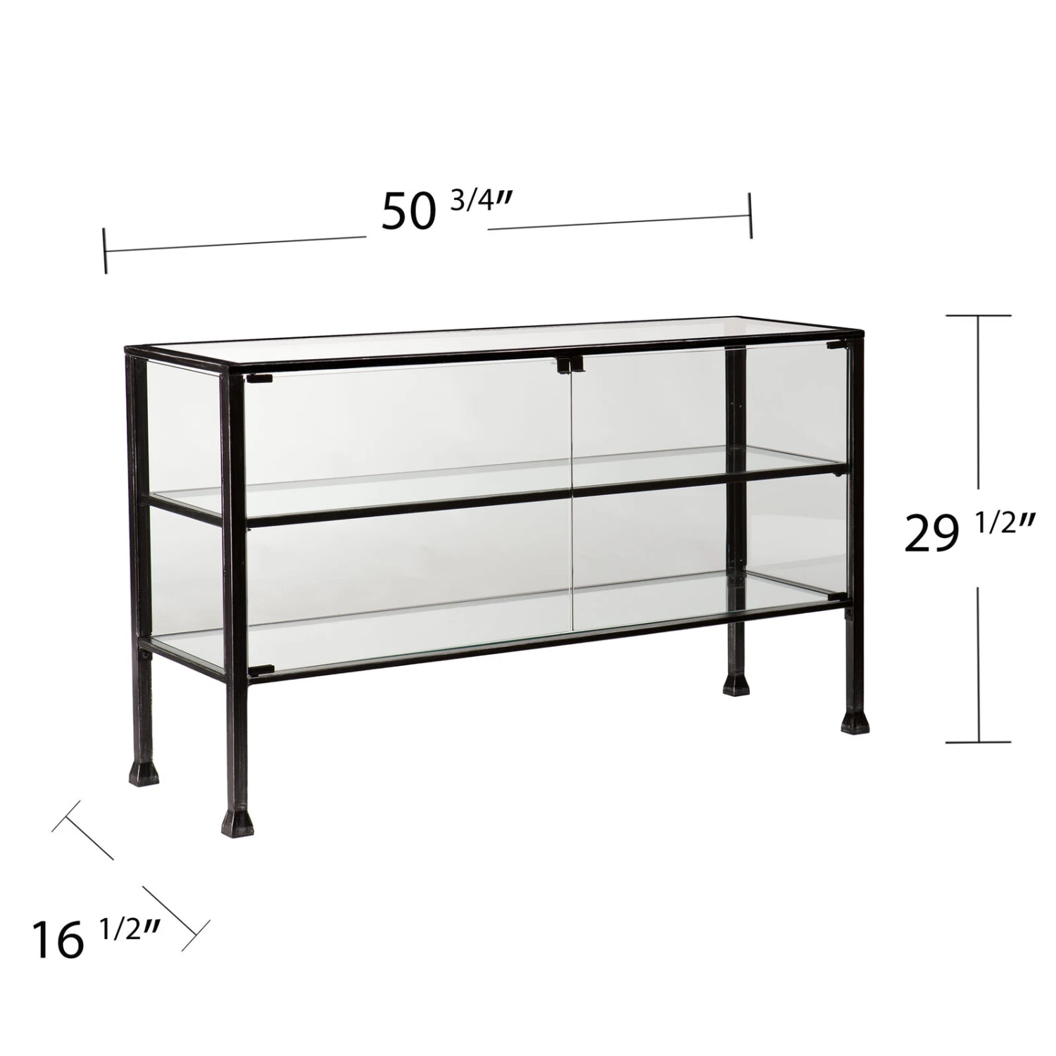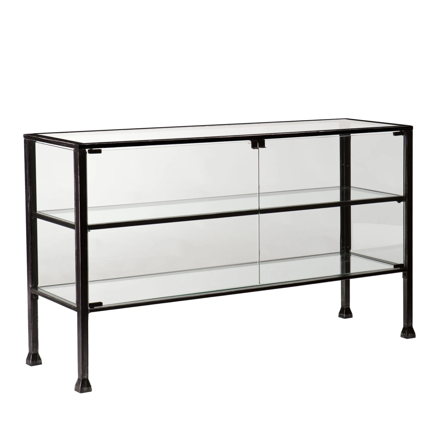 Sleek is as sleek does with this transitional console table. Black frame with silver distressing and glass panels evoke minimalist design, complementing every style of décor. Showcase a green thumb sans heat and outdoor mess and display indoor gardens, or strut your memorabilia and mementos for all to see. Best for lowlight houseplants and succulents, this chic console table brings the outdoors in. This item is not suitable for live animals. Do not use the glass display as an animal habitat or enclosure.