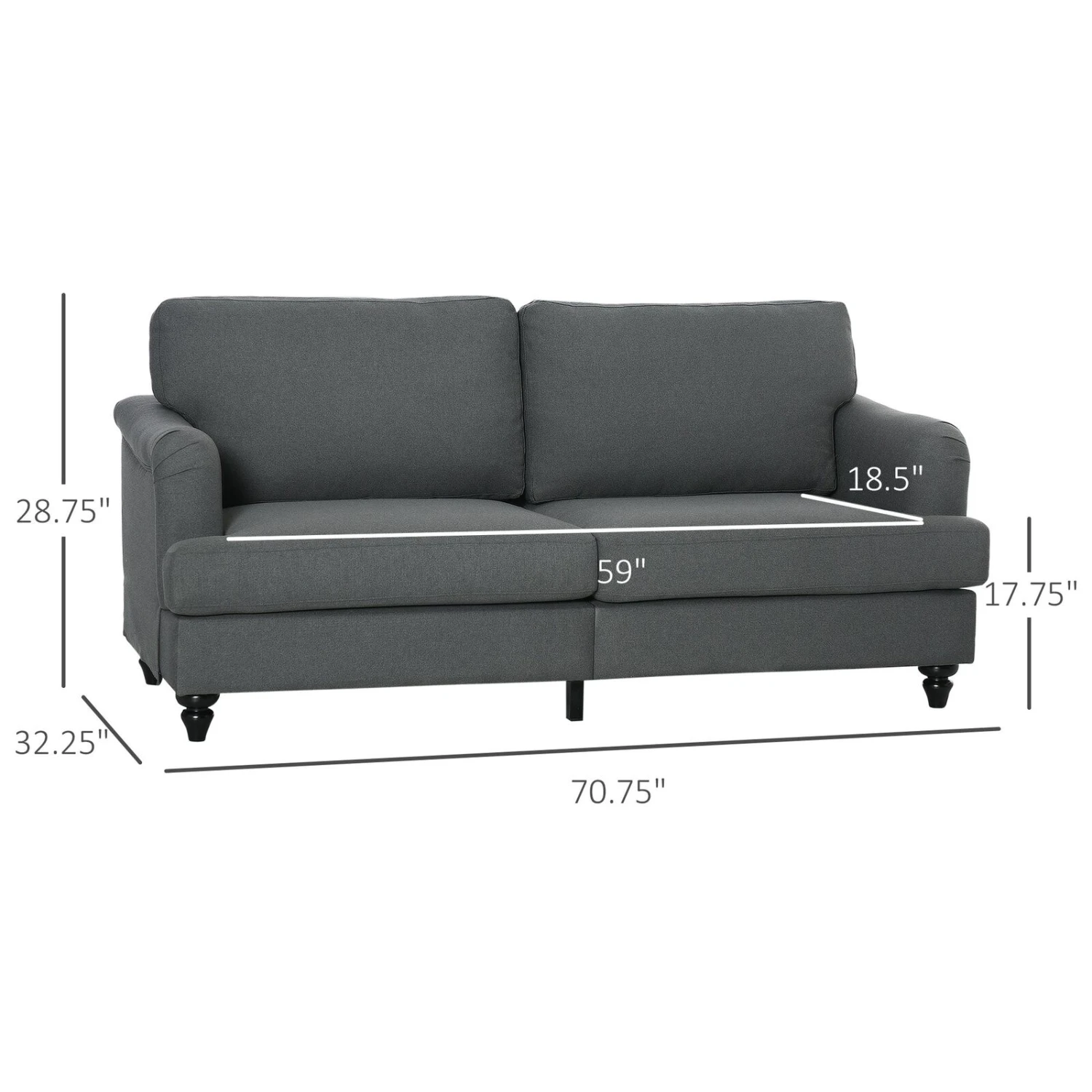 - – Bedroom Couch Information Overall Dimensions 70.75″ W x 32.25″ D x 28.75″ H. Seat Size 59″ W x 18.5″ D. Seat Height 17.75″. Weight Capacity 660 lbs. Assembly required.